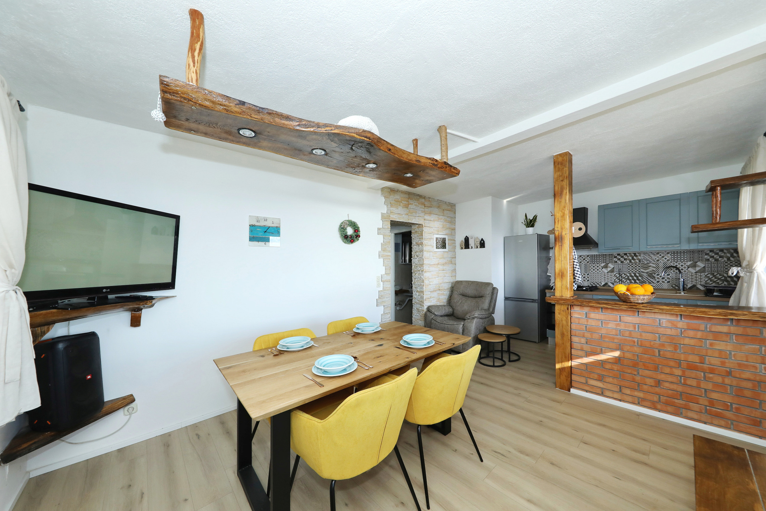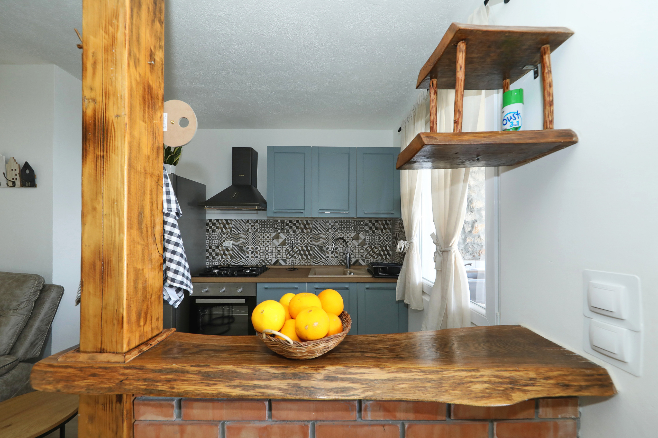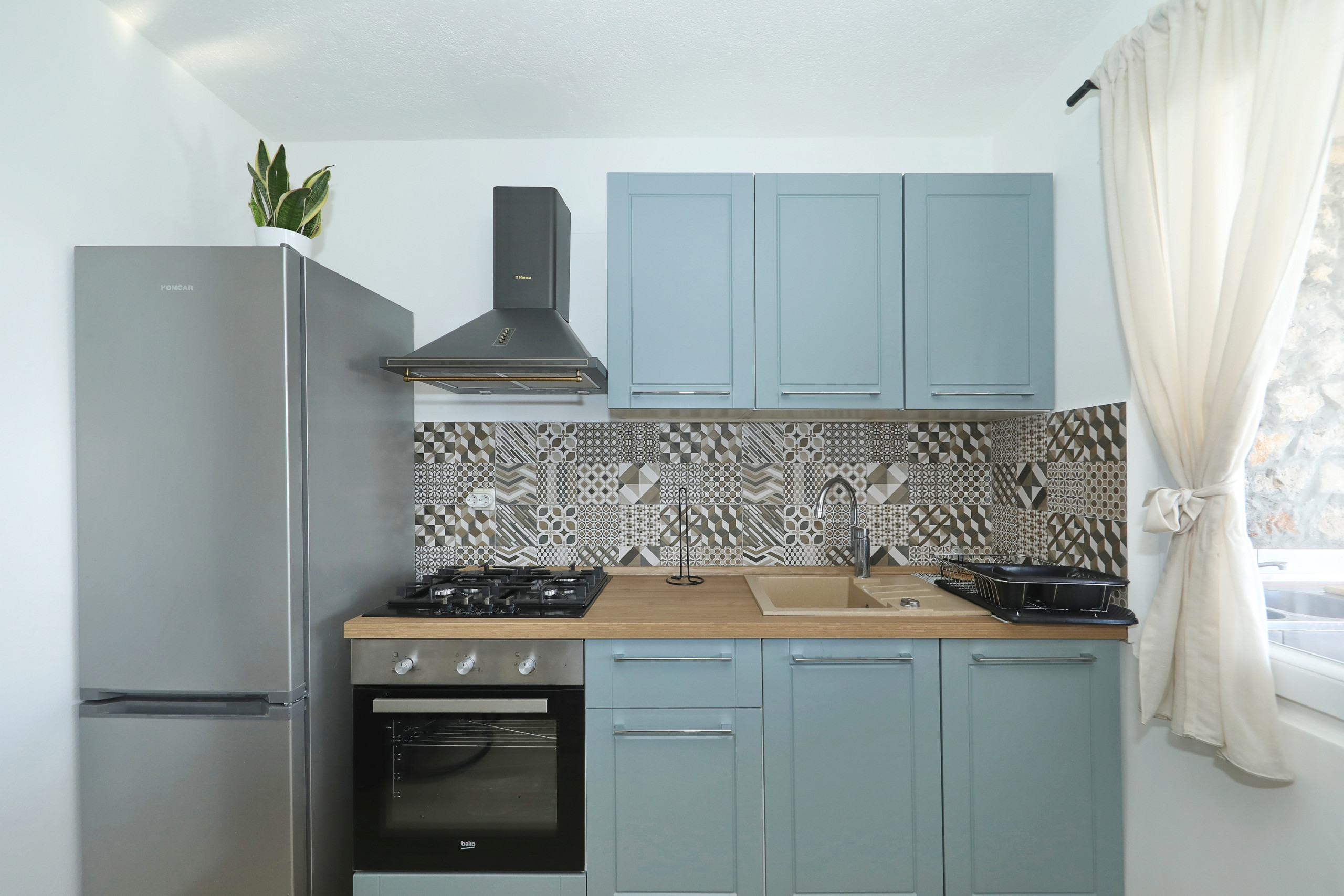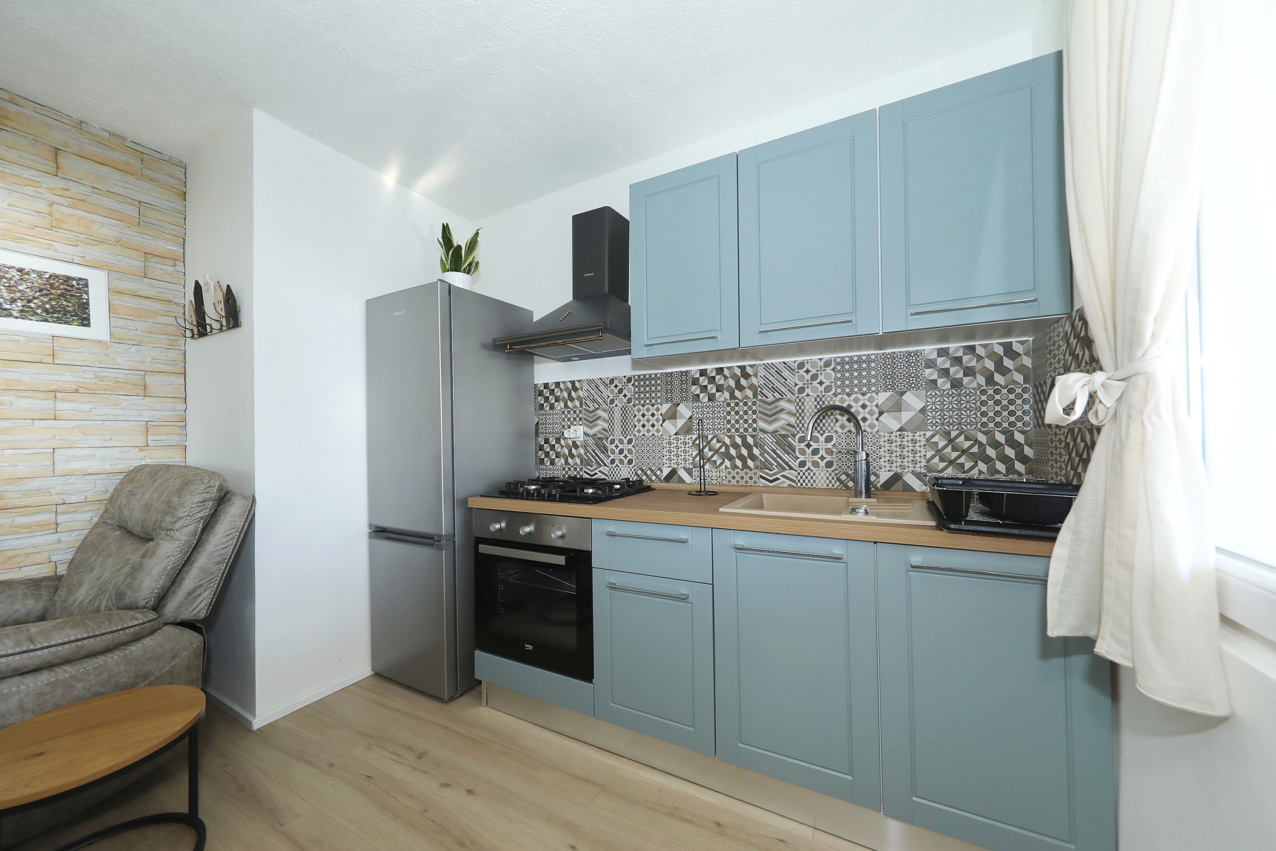 Die Offene Küche mit Gas-Kochfeld ist ausgestattet in einen Kühlschrank, ein Backofen, Geschirr/Besteck, Kochutensilien, eine Kaffeemaschine und einen Wasserkocher.