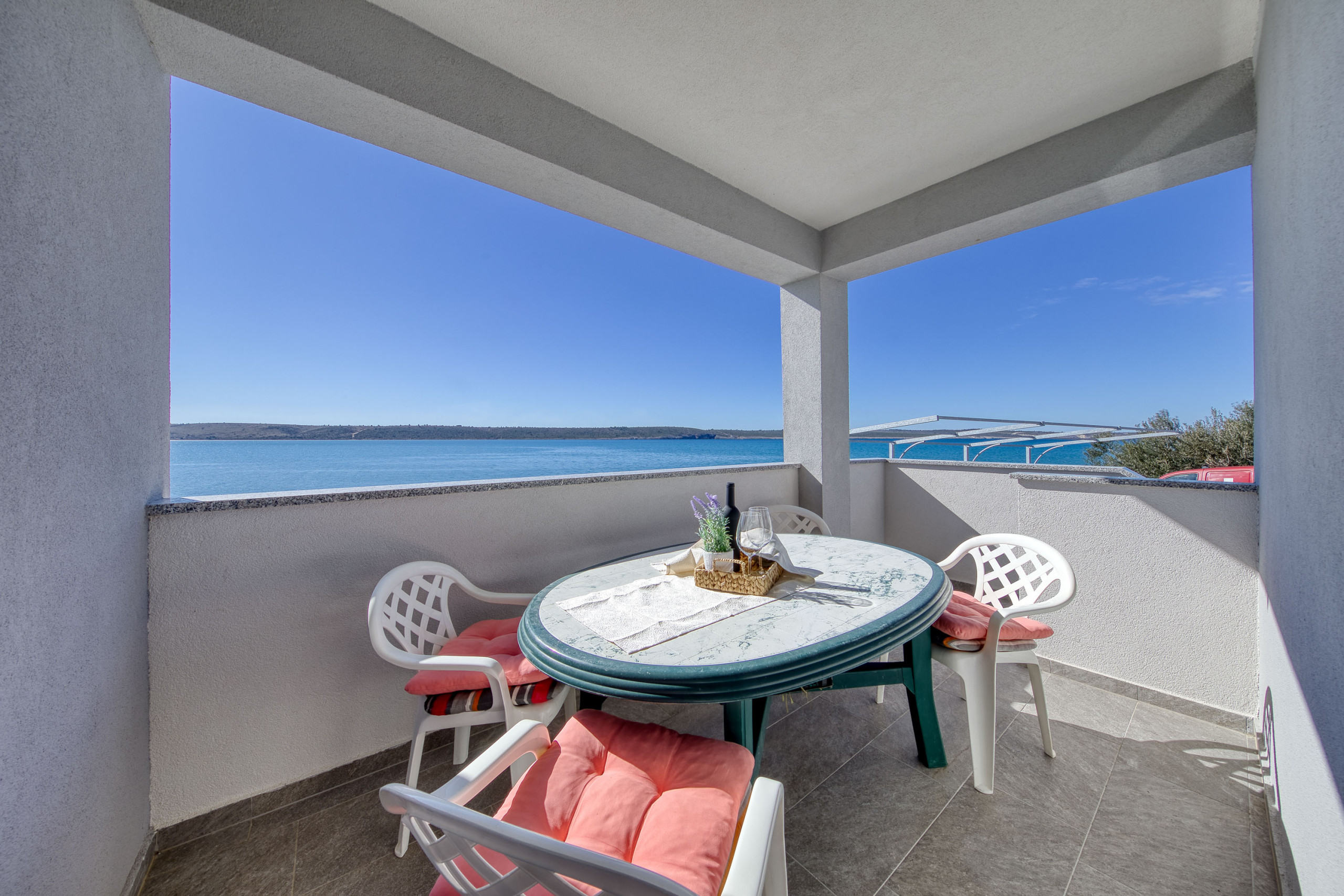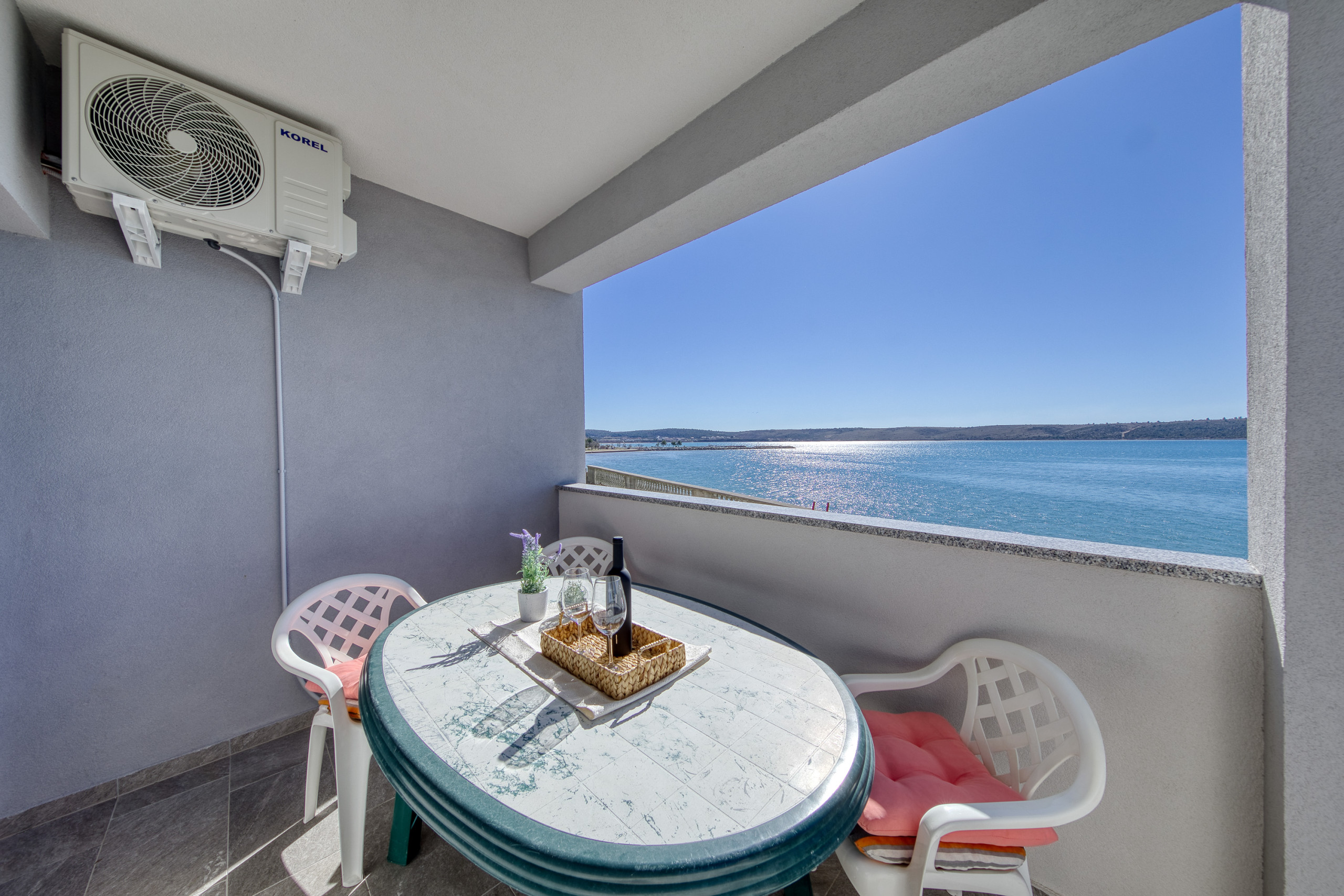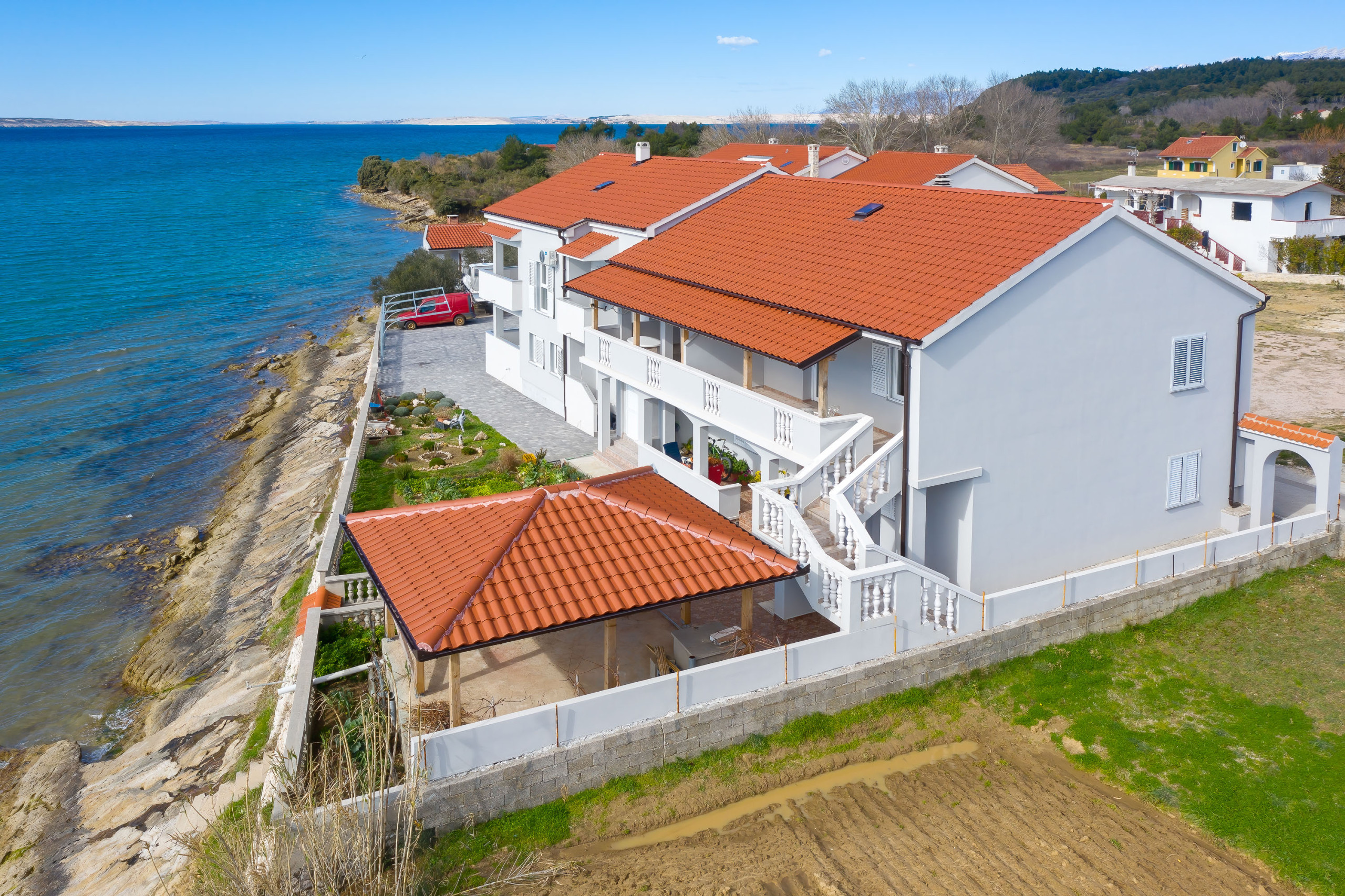 Das Haus verfügt über einen schönen Balkon und eine Terrasse mit Gartenmöbeln und Grillmöglichkeit. Die Lage direkt am Meer bietet atemberaubende Ausblicke auf das Wasser und den Garten. Ein privater Parkplatz für zwei Fahrzeuge ist ebenfalls vorhanden.