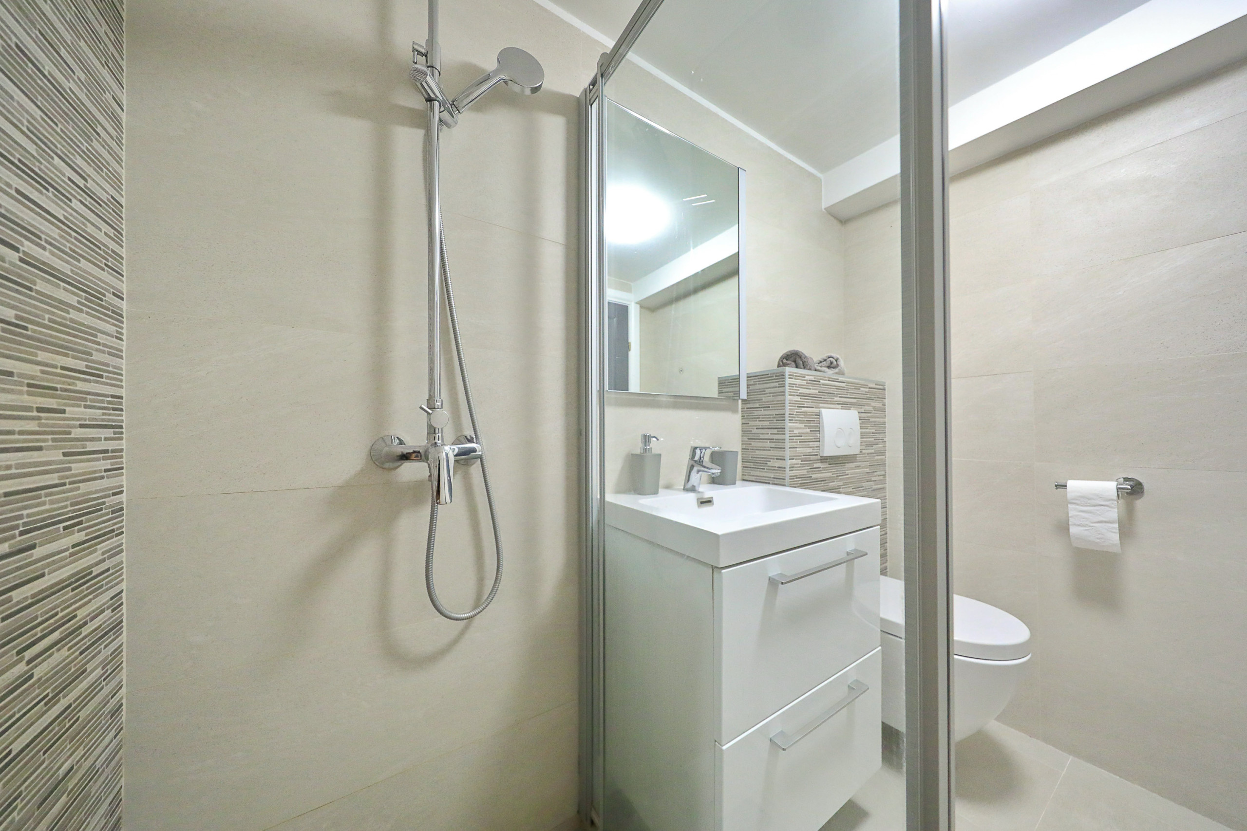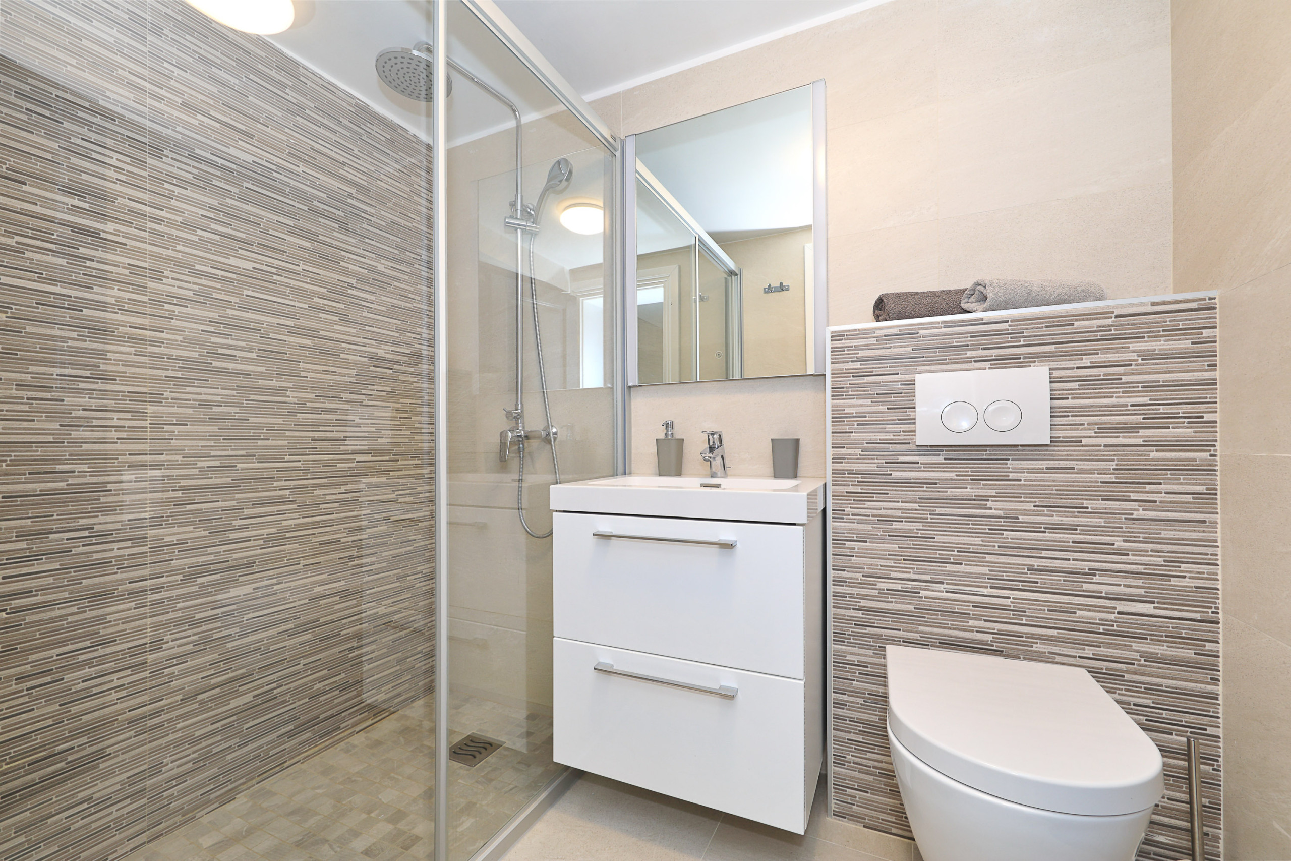 Das Badezimmer mit Dusche bietet alle notwendigen Annehmlichkeiten. Zusätzliche Extras wie Bügeleisen, Kleiderbügel, Erste-Hilfe-Set und Kaffeemaschine sorgen für maximalen Komfort.