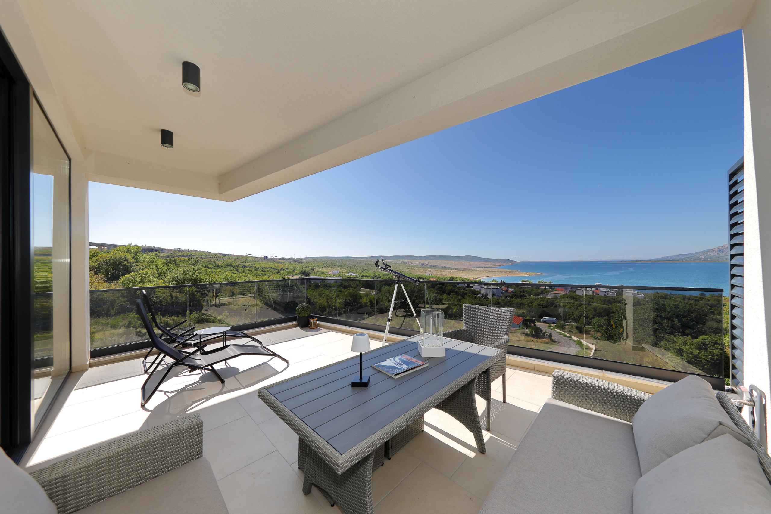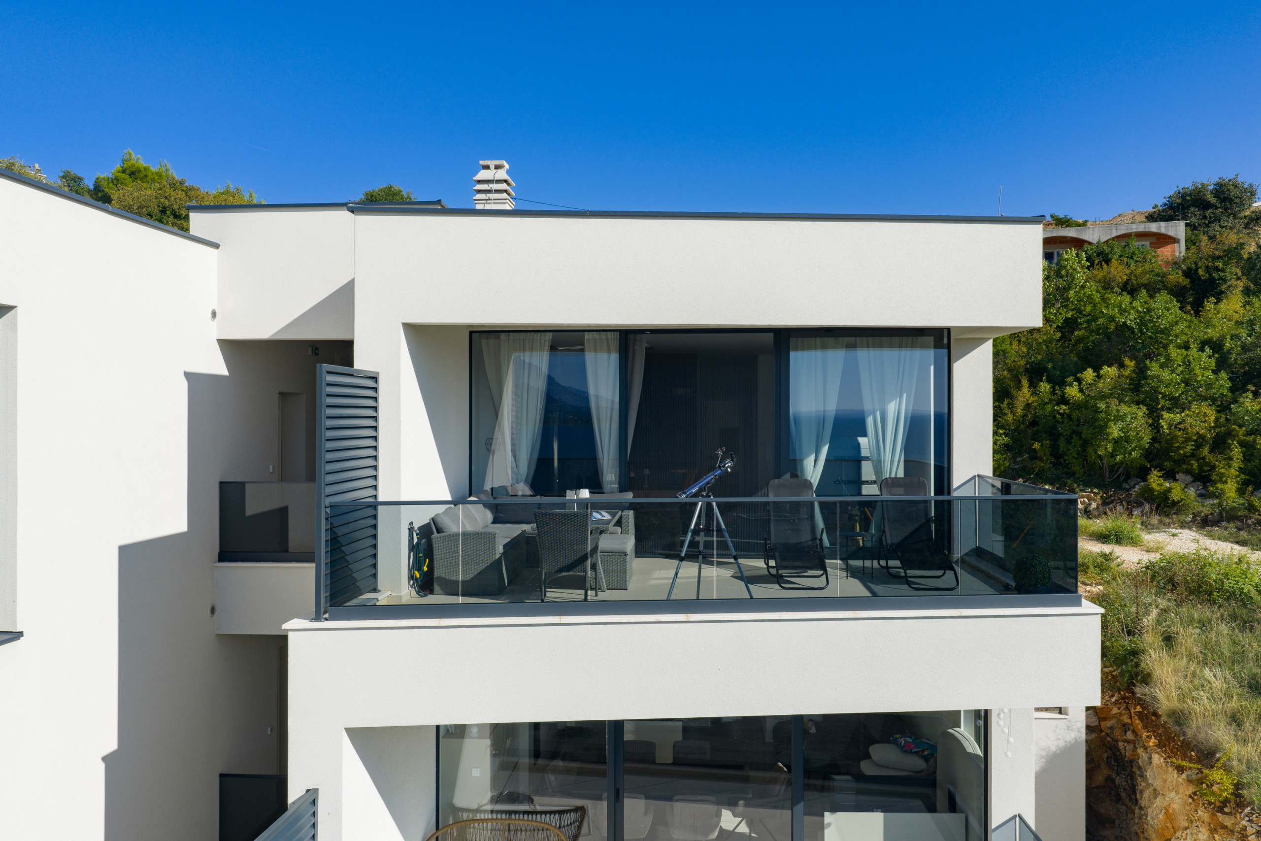 Genießen Sie die großzügige Terrasse von 20 m² mit Garten und Gartenmöbeln. Ein Barbecue-Bereich ermöglicht kulinarische Genüsse im Freien. Die Wohnung bietet zudem einen Balkon mit atemberaubenden Ausblicken auf das Meer, die Berge und den Garten.