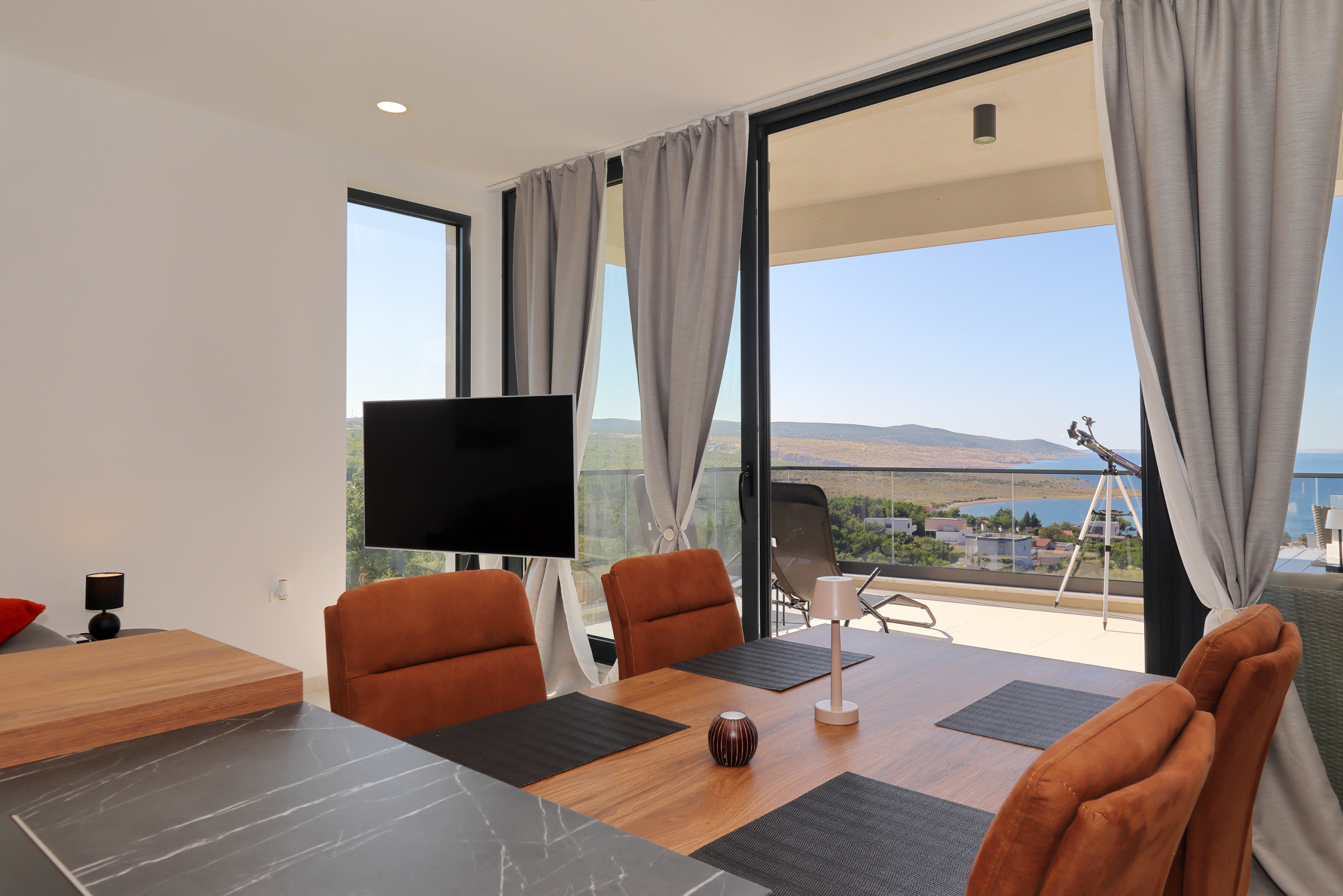 ... genutzt werden und bietet eine Grillmöglichkeit. Von der Wohnung aus hat man einen schönen Blick auf das Meer und die umliegenden Berge. Sie ist besonders geeignet für Radfahrer und verfügt über einen Wintergarten und einen Balkon mit Blick auf die Berge. An kühleren Abenden kann man es sich vor dem Kamin gemütlich machen. Die Ferienwohnung ist ein Nichtraucher-Objekt und bietet einen Panoramablick auf das Meer. Die offene Wohnküche ist modern eingerichtet und lädt zum Kochen und Verweilen ein. Zur Unterhaltung steht ein TV-Flachbildgerät zur Verfügung. Auch Familien sind in dieser Unterkunft willkommen. Einkaufsmöglichkeiten befinden sich ca. 500 m entfernt, der Strand ist in ca. 700 m erreichbar und ein Restaurant ist ca. 500 m entfernt. Auf Wunsch kann ein SUB zur Verfügung gestellt werden. Bei Anreise ist eine Kaution von 100 € in bar beim Eigentümer zu hinterlegen.