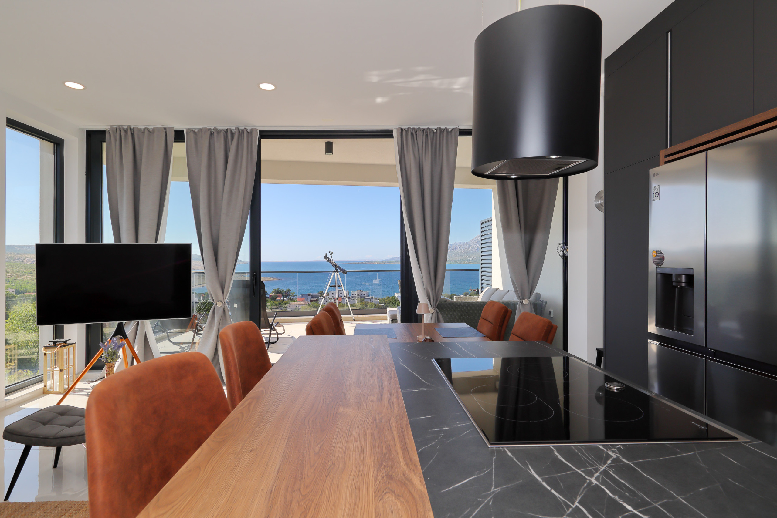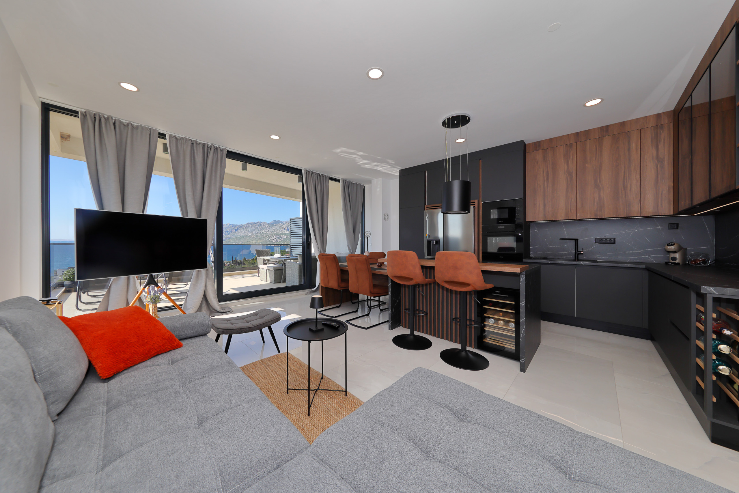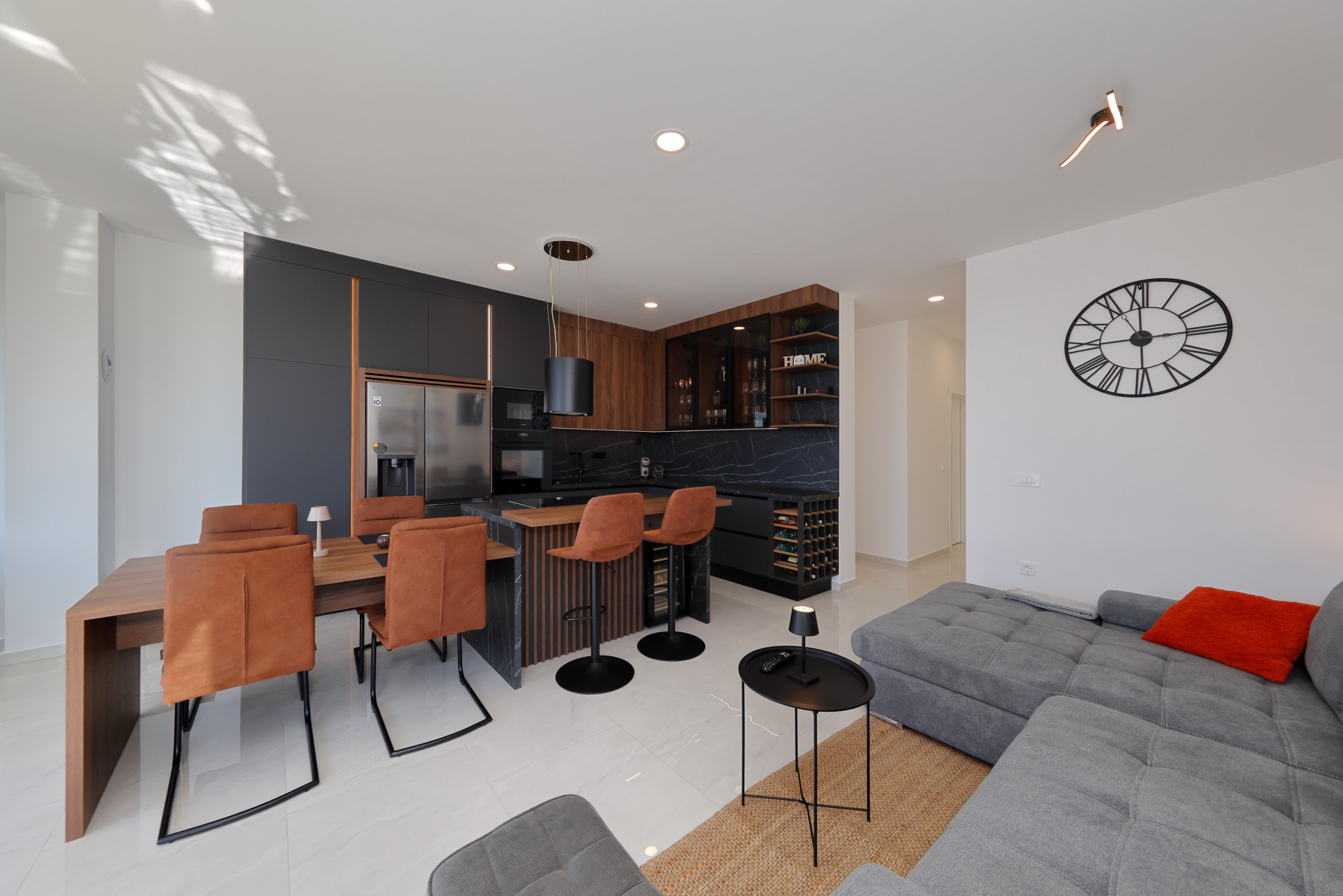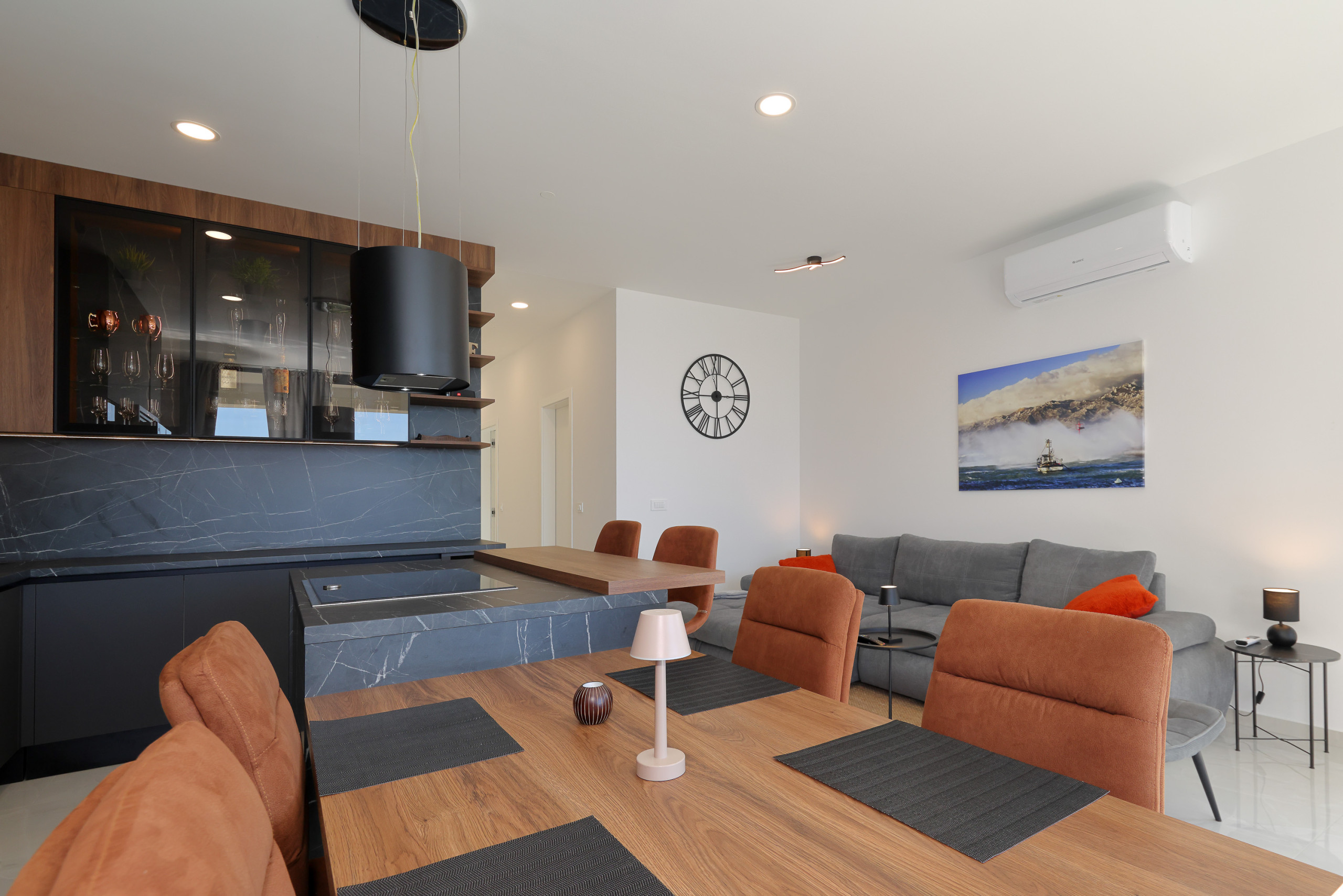 Die moderne Küche ist vollständig ausgestattet mit hochwertigen Geräten, einschließlich Induktionsherd, Kühlschrank, Gefrierschrank, Geschirrspüler, Backofen, Mikrowelle, Kaffeemaschine und allem notwendigen Küchengeschirr. Perfekt zum Zubereiten köstlicher Mahlzeiten und zum gemeinsamen Genießen.