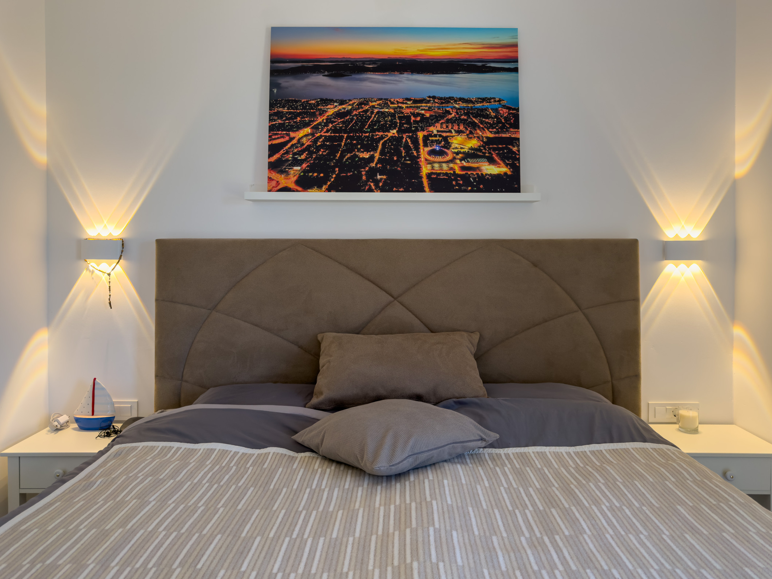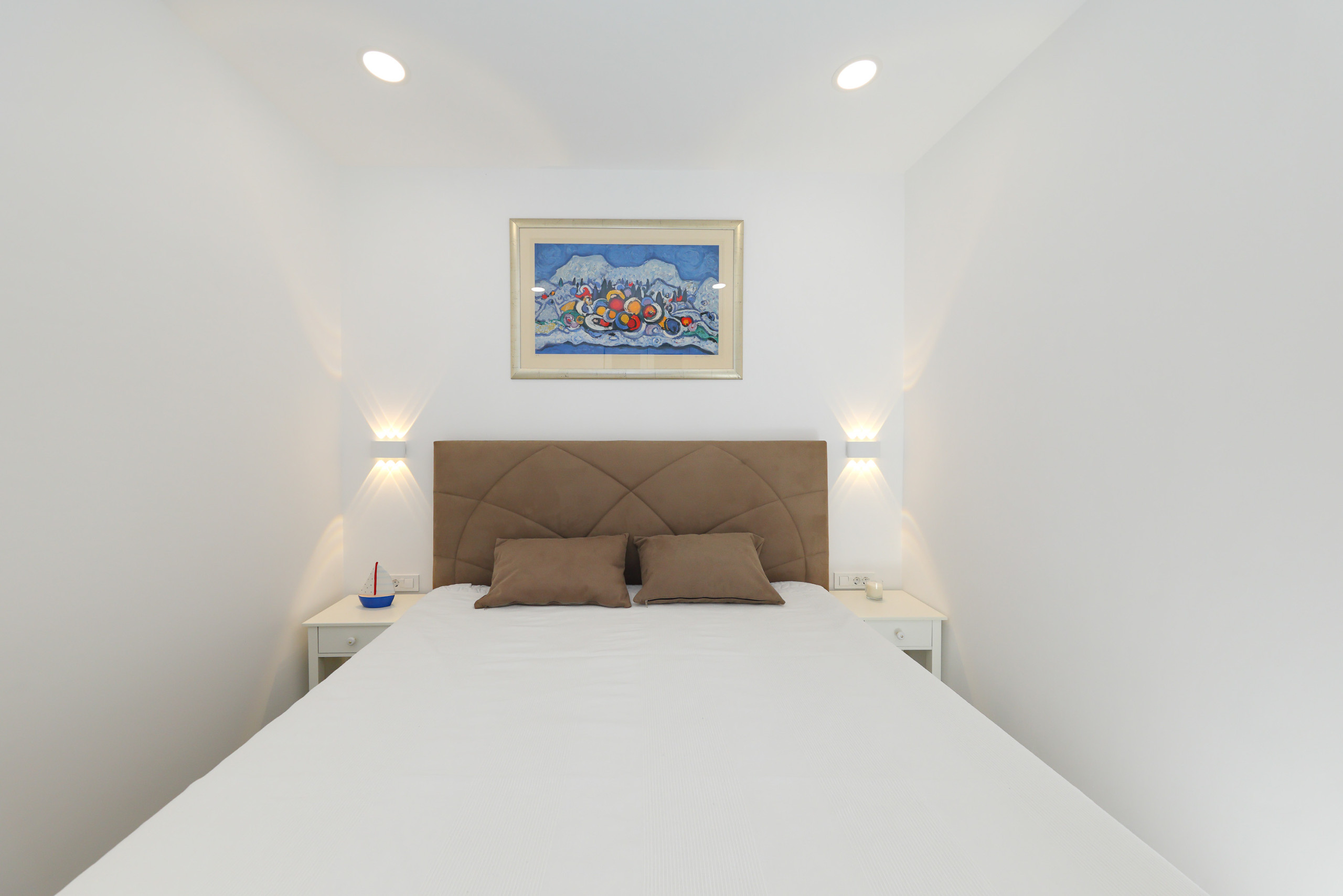 Die Wohnung verfügt über drei gemütliche Schlafzimmer mit insgesamt vier Betten: ein Kingsize-Bett, zwei Queensize-Betten und ein Schlafsofa. Zwei moderne Badezimmer sorgen für ausreichend Komfort, wobei eines eine Dusche und das andere eine Toilette hat.