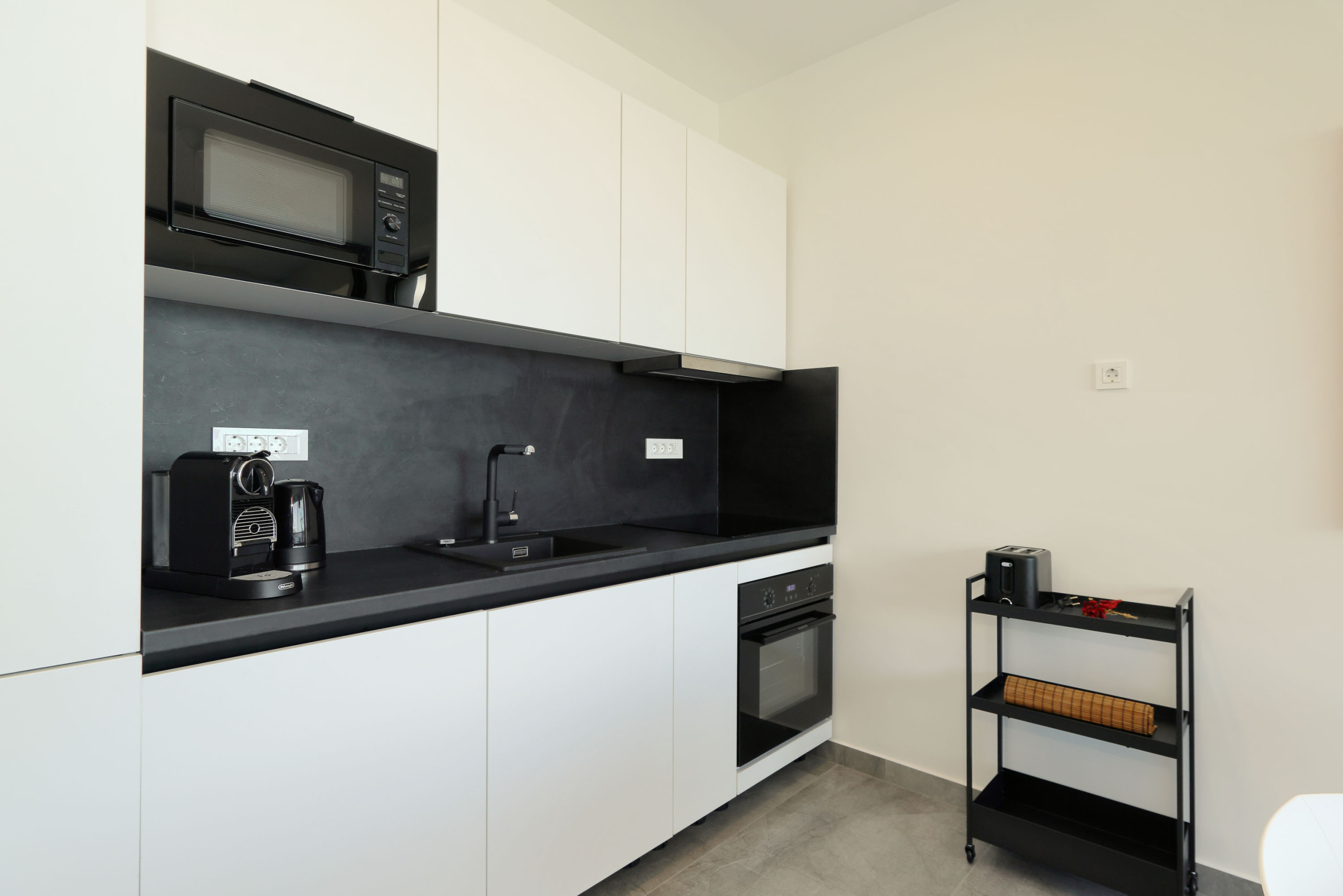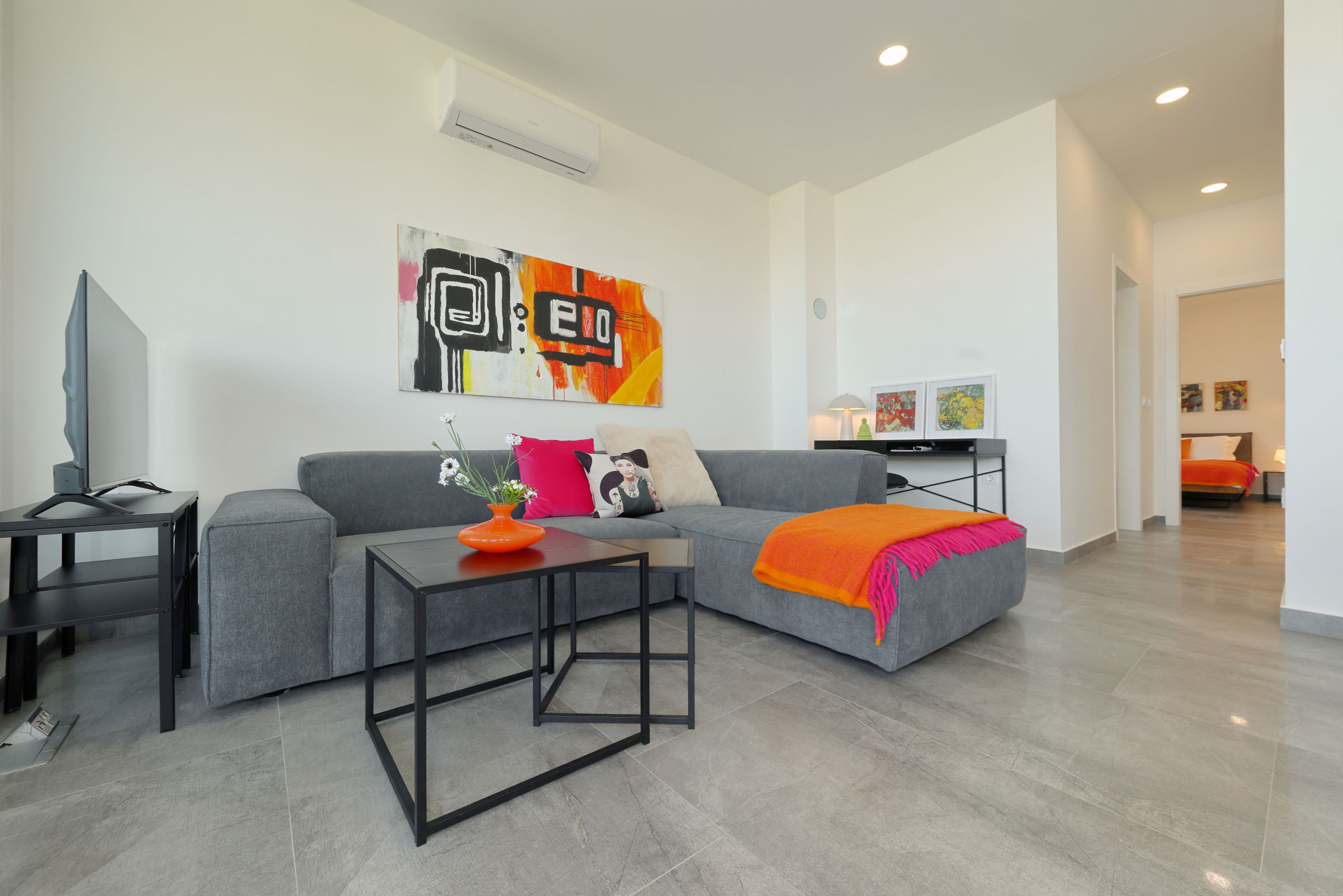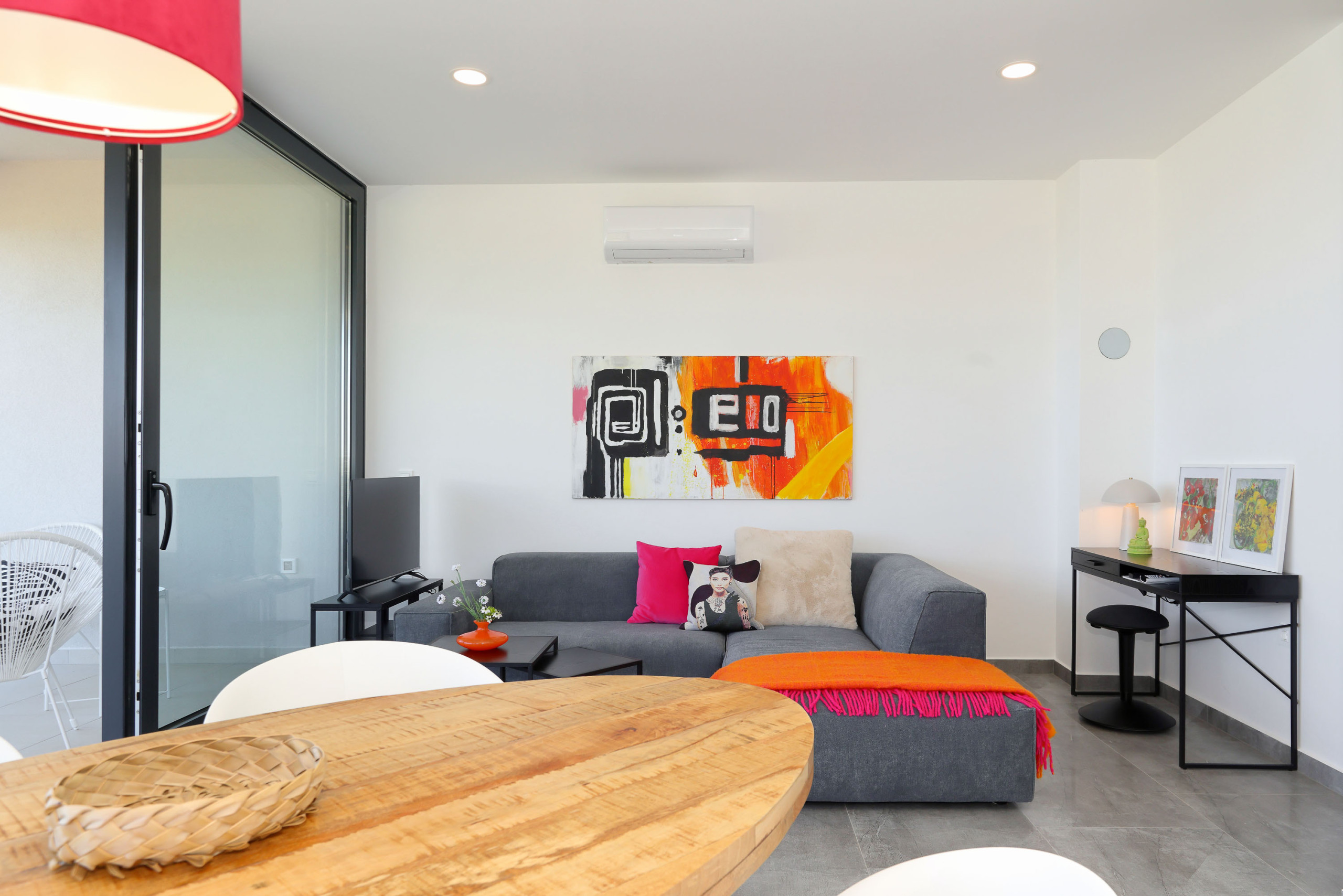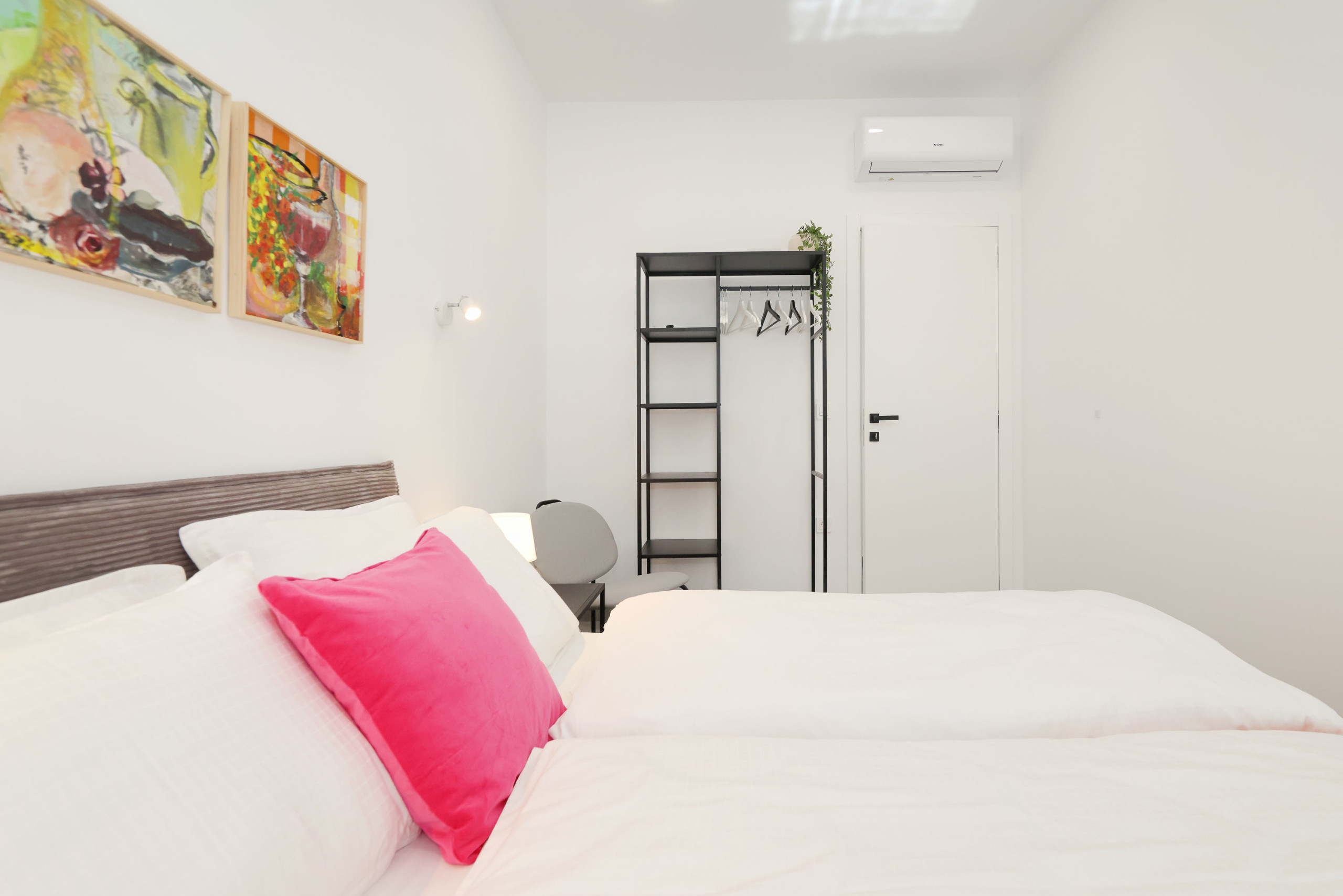 Im Inneren der Unterkunft befinden sich zwei klimatisierte Schlafzimmer mit komfortablen Doppelbetten, die auch an heißen Sommertagen für erholsamen Schlaf sorgen. Der helle Wohnbereich bietet mit einem bequemen Sofa, einem Smart-TV und einem Schreibtisch viel Platz zum Entspannen oder Arbeiten. Kostenloses Highspeed-WLAN ist in der gesamten Wohnung verfügbar. Die offene Küche ist vollständig ausgestattet, sodass auch längere Aufenthalte problemlos und angenehm gestaltet werden können.