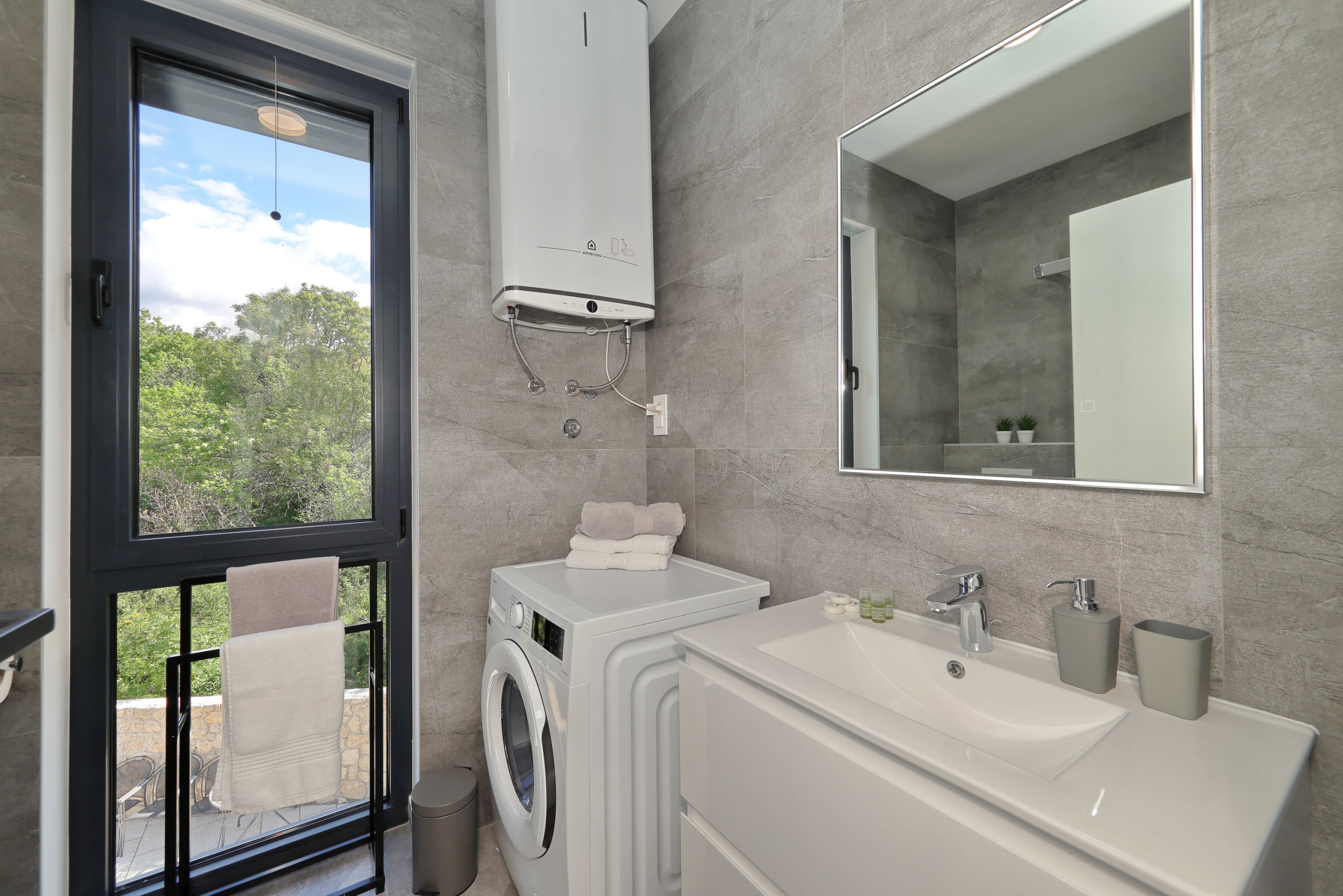 Das Badezimmer ist modern eingerichtet mit Dusche, WC und Waschmaschine, zusätzlich steht ein praktischer Abstellraum mit Bügeleisen, Bügelbrett und Reinigungsutensilien zur Verfügung. Die gesamte Wohnung ist mit hochwertigen Porzellanfliesen ausgestattet, was für ein sauberes, hygienisches und allergikerfreundliches Wohngefühl sorgt.