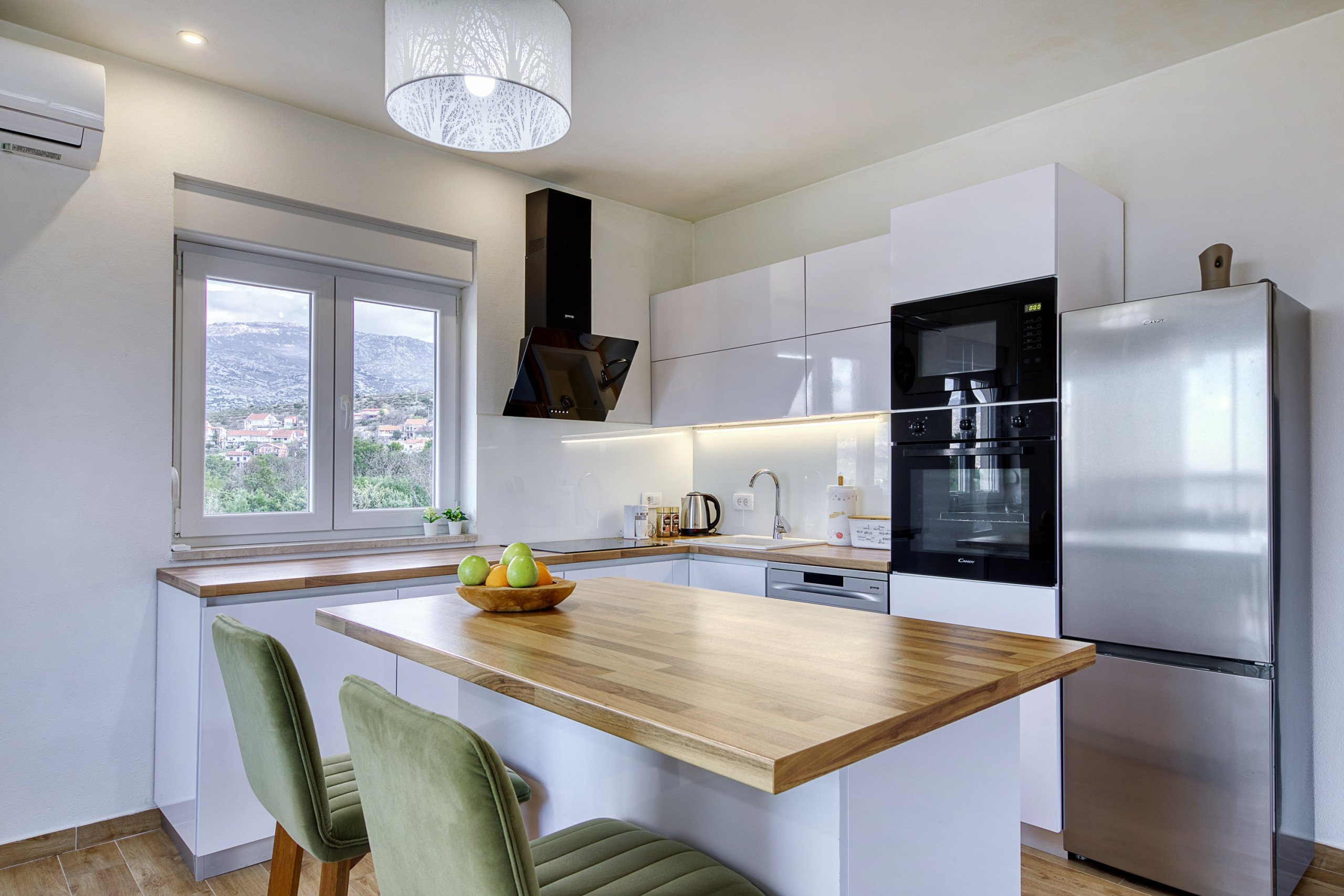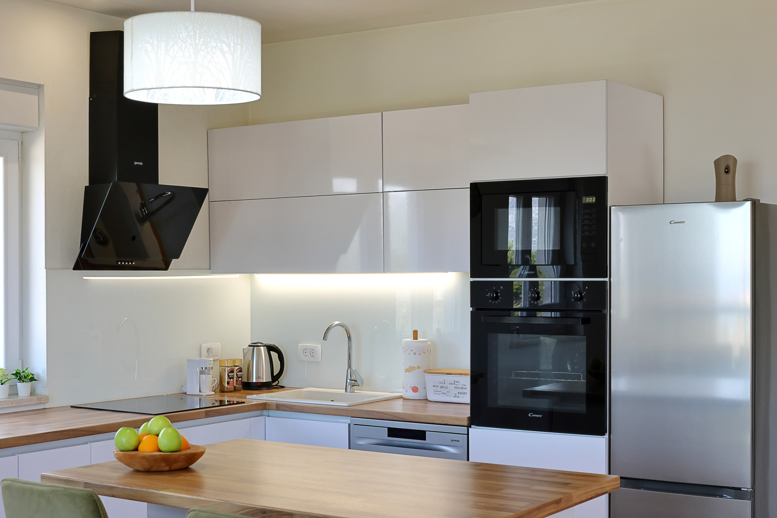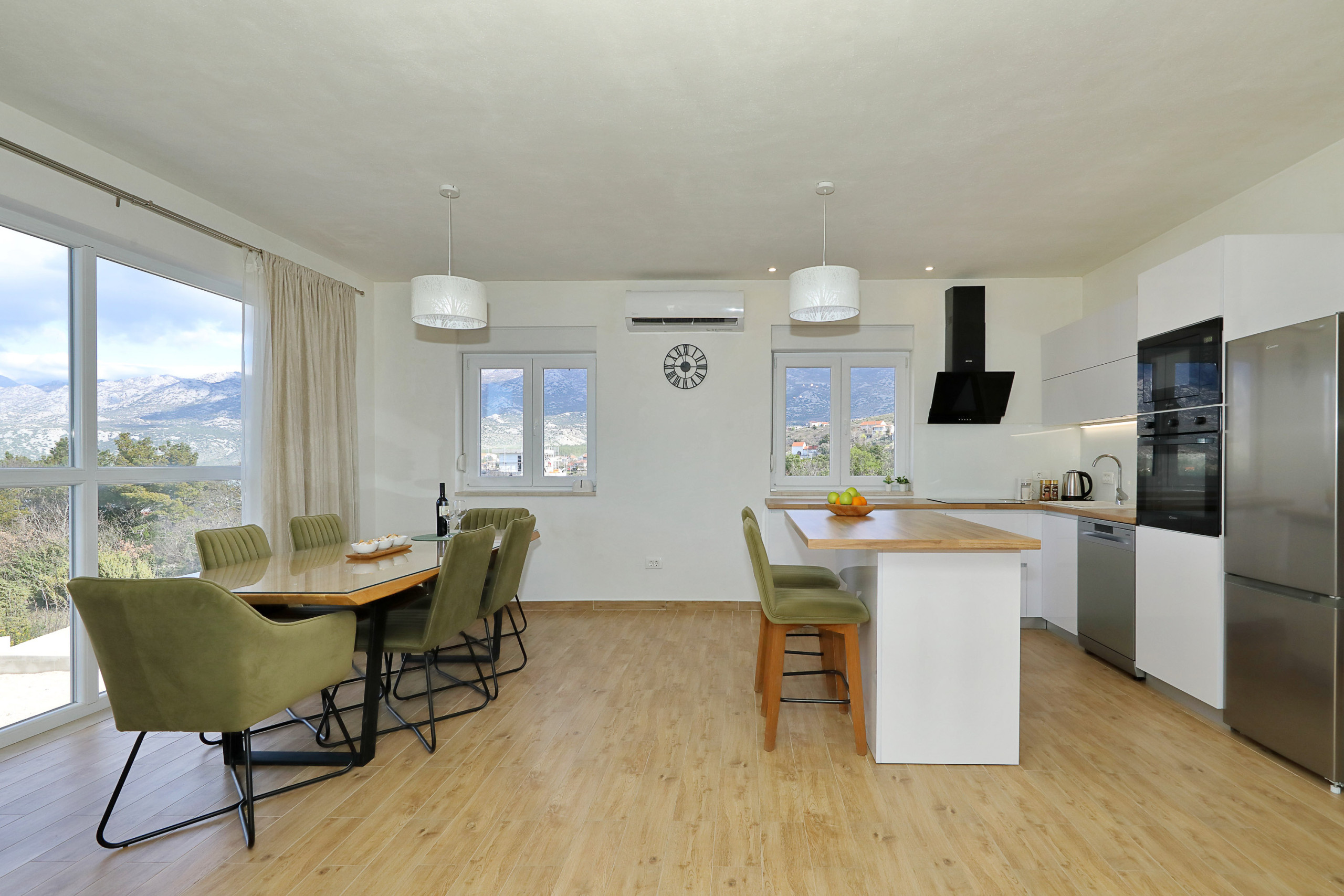 Die voll ausgestattete amerikanische Küche lässt keine Wünsche offen. Sie bietet Geräte wie Herd, Backofen, Mikrowelle, Kaffeemaschine, Geschirrspüler, Kühlschrank, Gefrierschrank und alle notwendigen Küchenutensilien. Ein Esstisch lädt zum gemeinsamen Speisen ein.