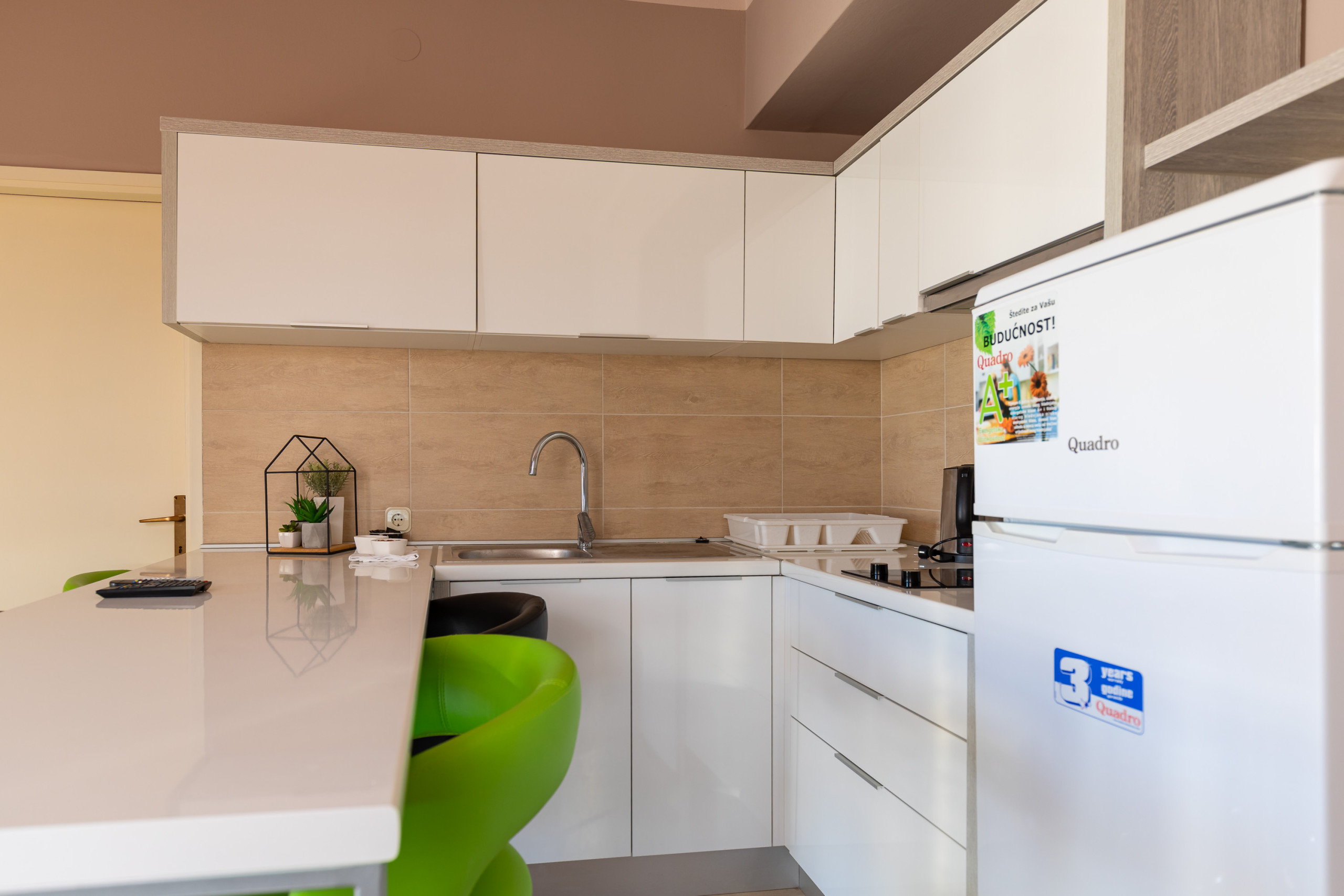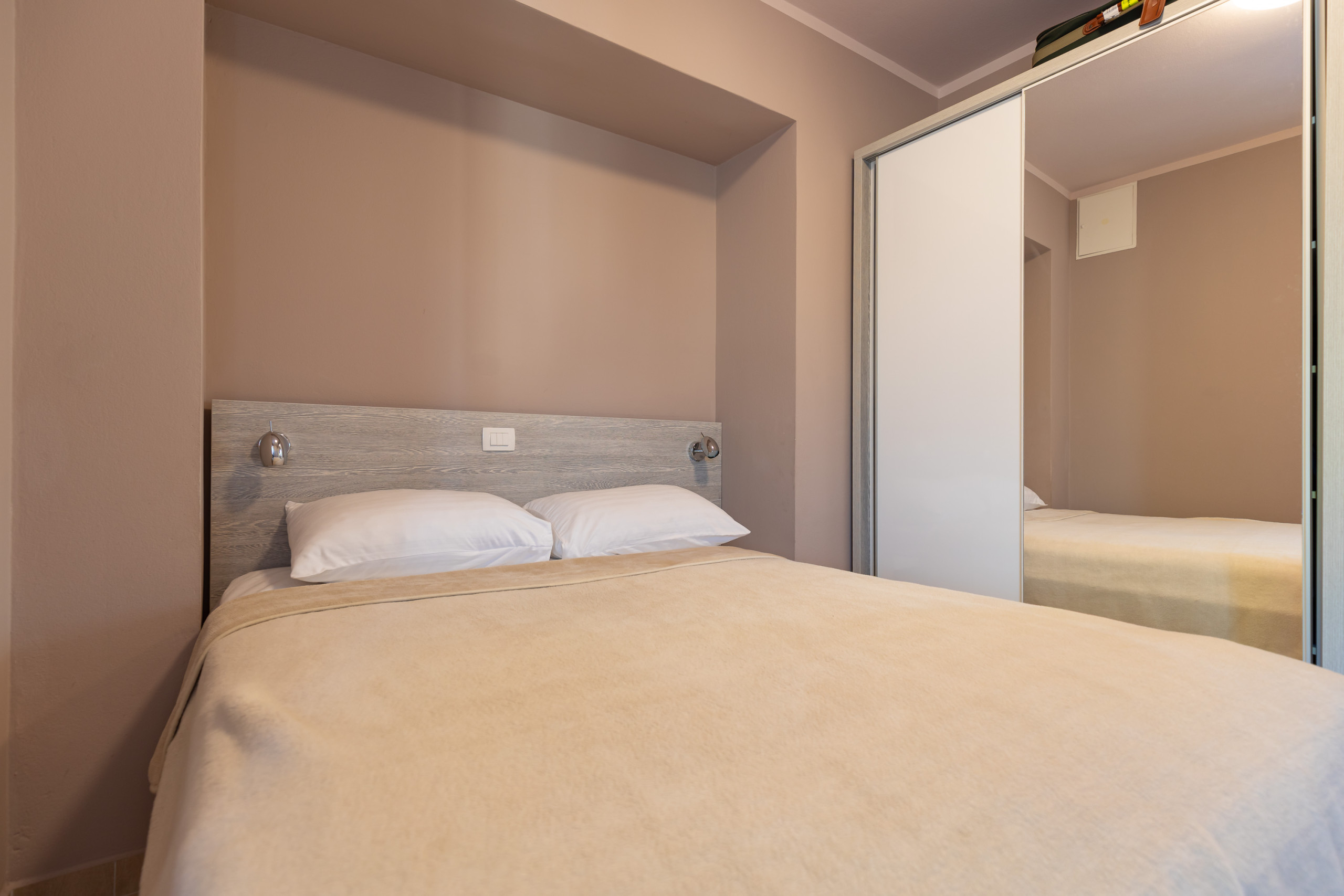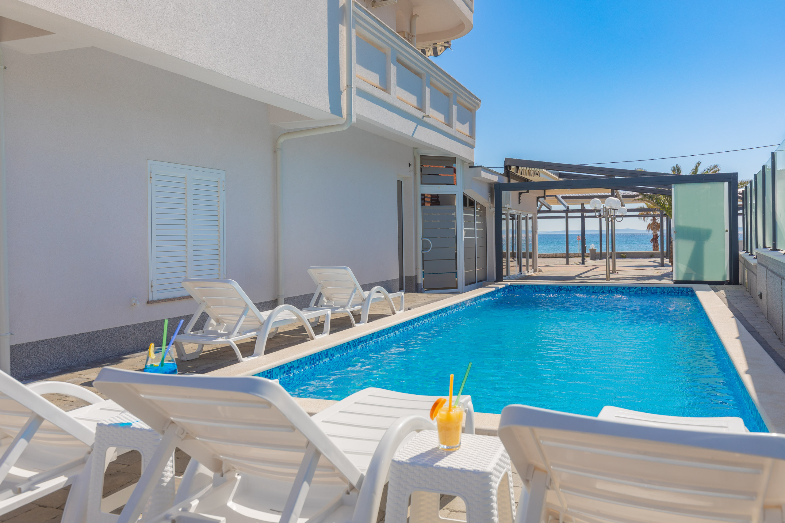 Das Ferienhaus Paradiso, bietet Ihnen ein Apartment mit Meerblick. Das 47 qm große Apartment eignet sich für bis zu 5 Personen. Zu diesem im Obergeschoss gelegenem Apartment, gehört ein sonnenreicher Balkon mit Markise und wundervollen Blick auf die Adria. Alleine nur vom Balkon aus lässt es sich den ganzen Tag wunderbar entspannen.Das Apartment ist mit einem Duschbad, einem Doppelbett und Einzelbett Schlafzimmer, einem Wohnbereich mit gemütlicher Couch - die sich bei Bedarf zu einem weiteren Schlafplatz umfunktionieren lässt und einer Küchennische mit Essbereich ausgestattet.Kostenlos stehen Ihnen im klimatisierten Apartment das W-LAN und eine Stellplatz für Ihren PKW zur Verfügung, wie auch die Nutzung des Pools im Außenbereich.Der Pool steht Ihnen von 9:00 Uhr bis 19:00 Uhr zur Verfügung . Da dieser direkt an das Bistro und die Panoramaterrasse grenzt, ist es uns ein Anliegen dass jeder Gast sein Abendessen in ruhe zu sich nehmen kann, ohne sich eventuell gestört zu fühlen.Im Bistro des Hauses und der dazugehörigen großen Panoramaterrasse haben Sie die Möglichkeit Ihr Mittag- und Abendessen à la carte einnehmen. Alle Speisen werden separat und unabhängig von Ihrer Buchung im Bistro berechnet.Gegen bezahlung , können Sie im hauseigenem Waschsalon den Wäschesevice nutzenHaustiere sind gestattet.