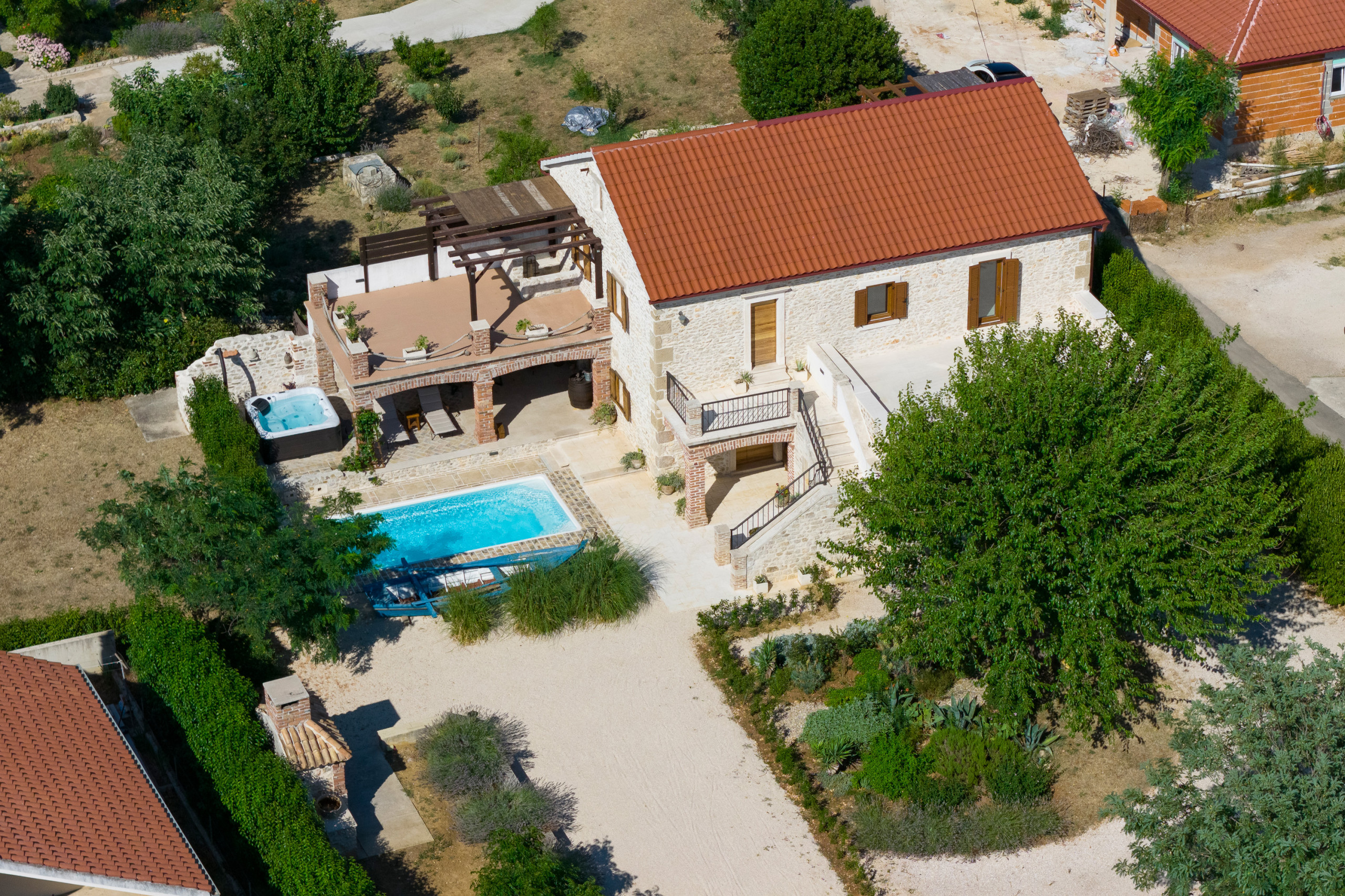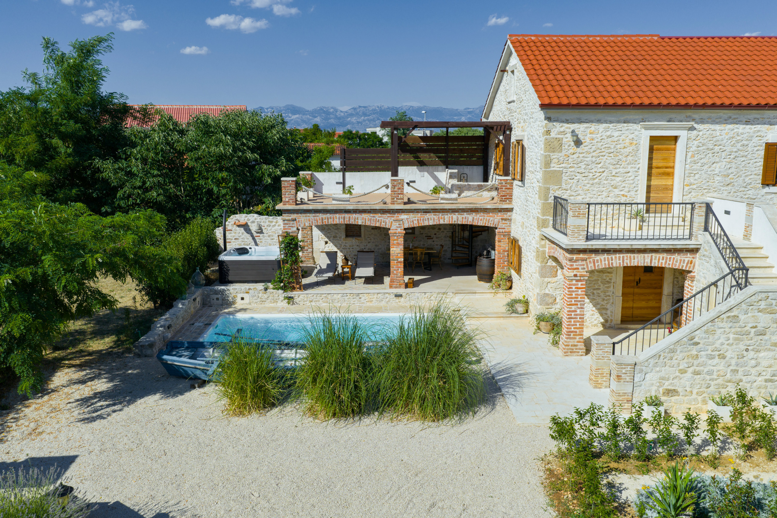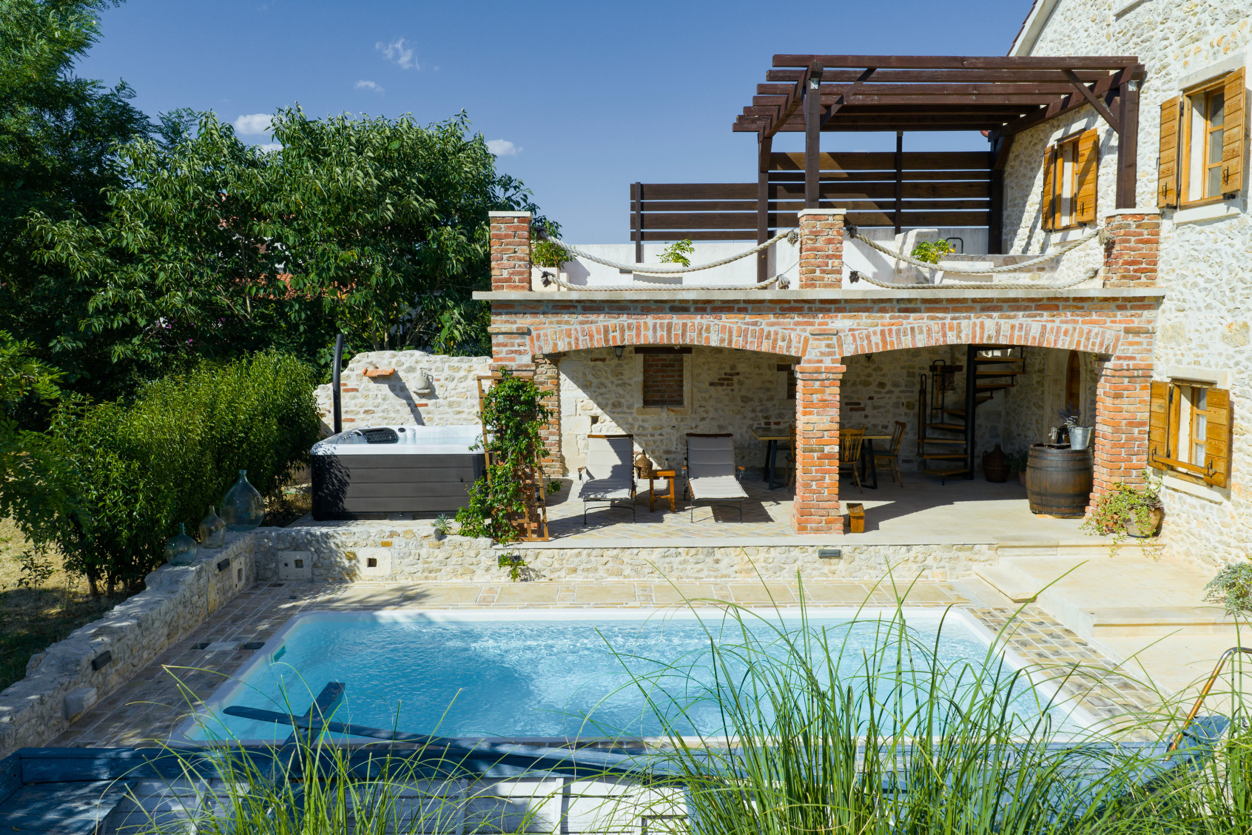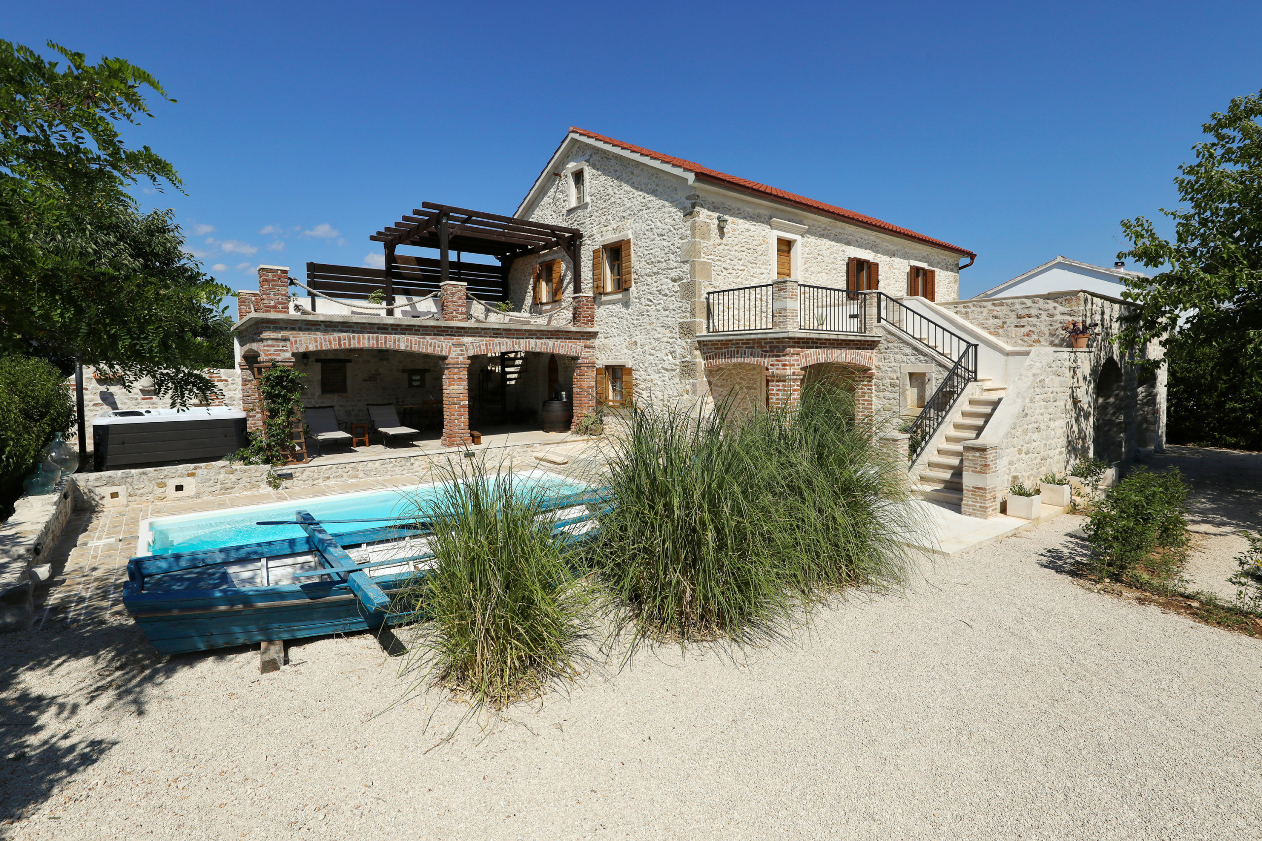 Im Garten erwartet Sie ein großer Pool. Auf der überdachten Terrasse steht für Sie eine gemütliche Sitzecke bereit, sowie Sonnenliegen die zum Verweilen einladen. Versuchen Sie sich an dalmatinischen Spezialitäten und nutzen Sie den Grill. Der Whirlpool neben der Terrasse erhöht den Wohlfühlfaktor. Von der Terrasse im Erdgeschoss geht eine Wendeltreppe auf, von der Sie auf den großen und möblierten Balkon gelangen. Bewundern Sie von hier den klaren Sternenhimmel und den Blick auf das große Anwesen.