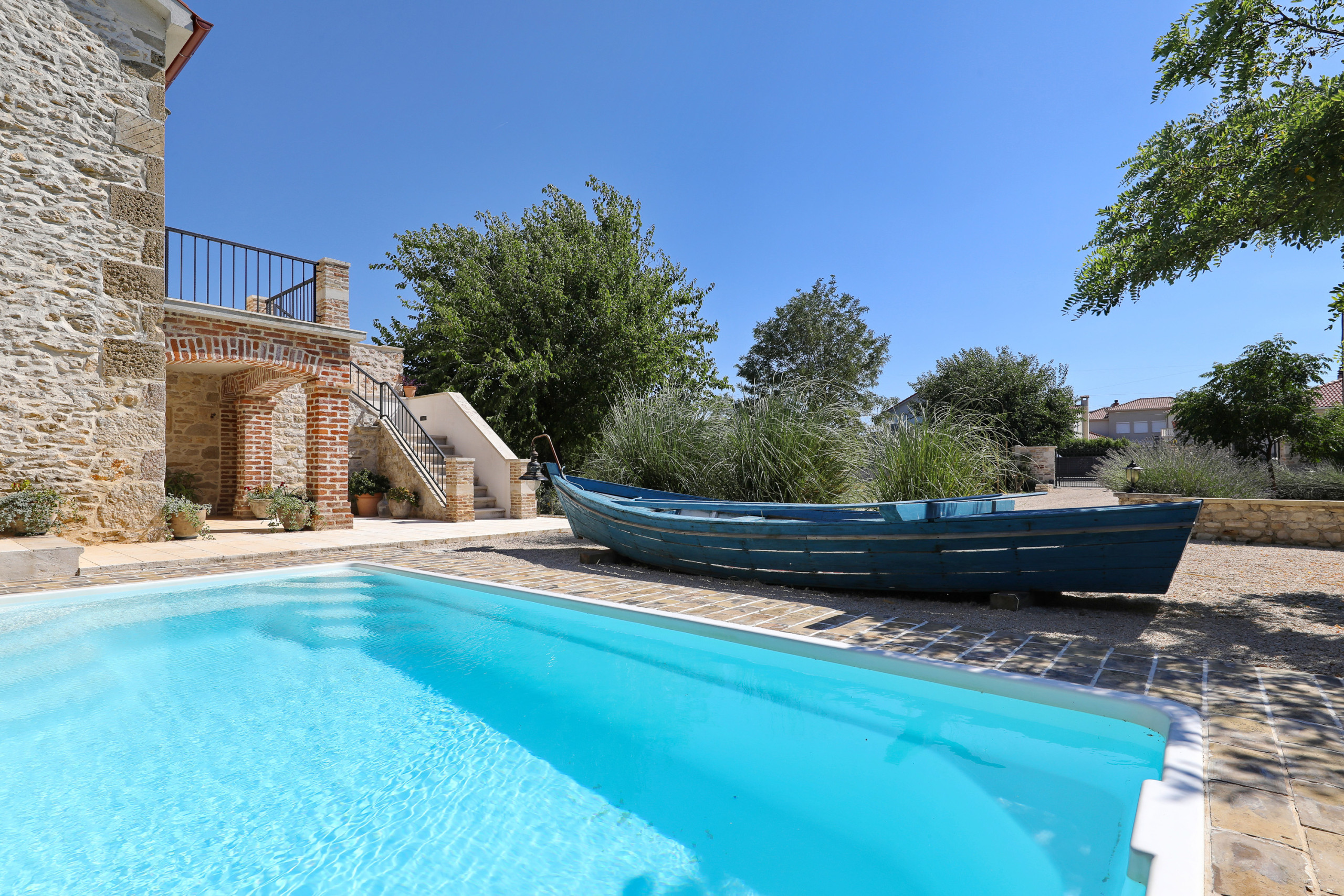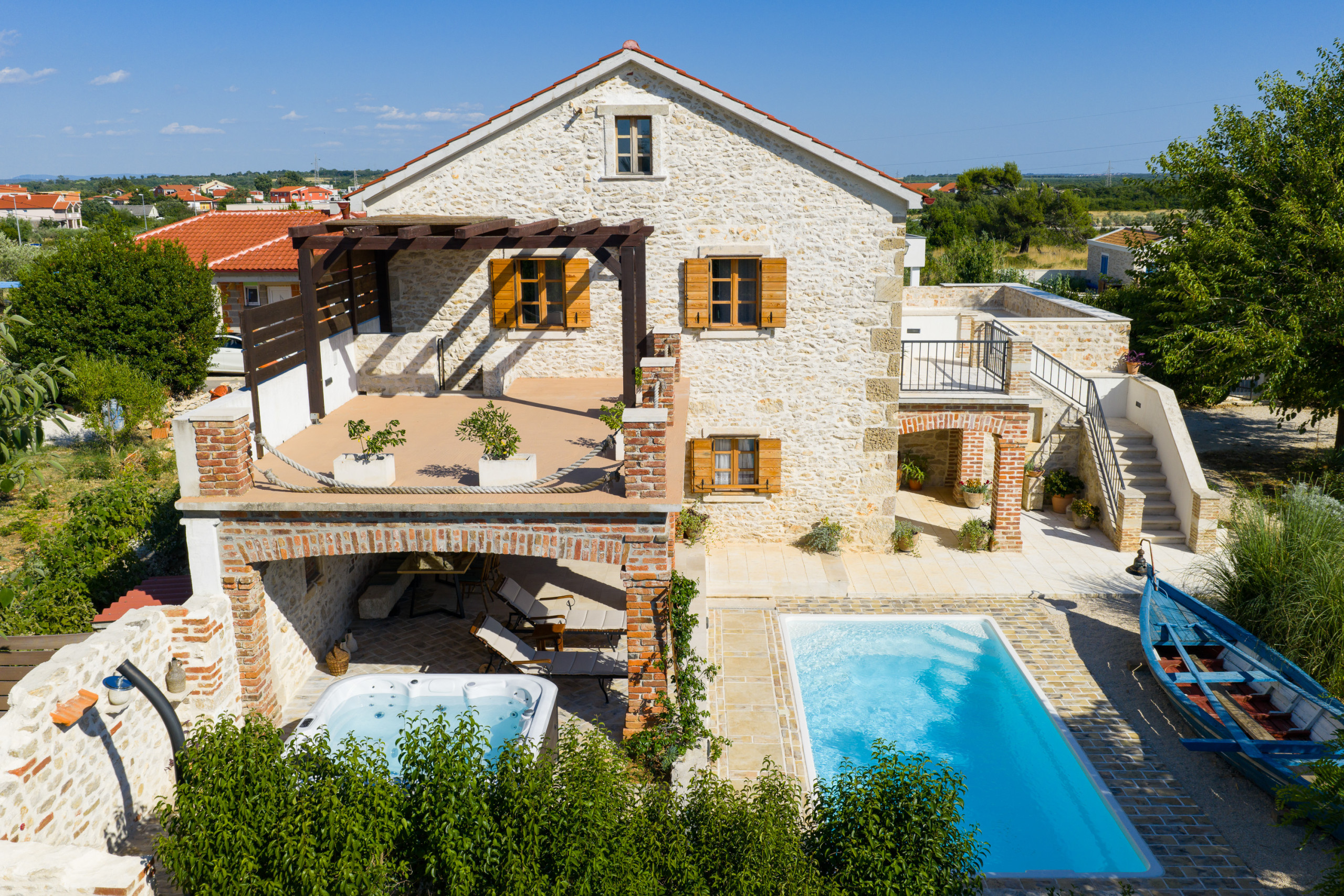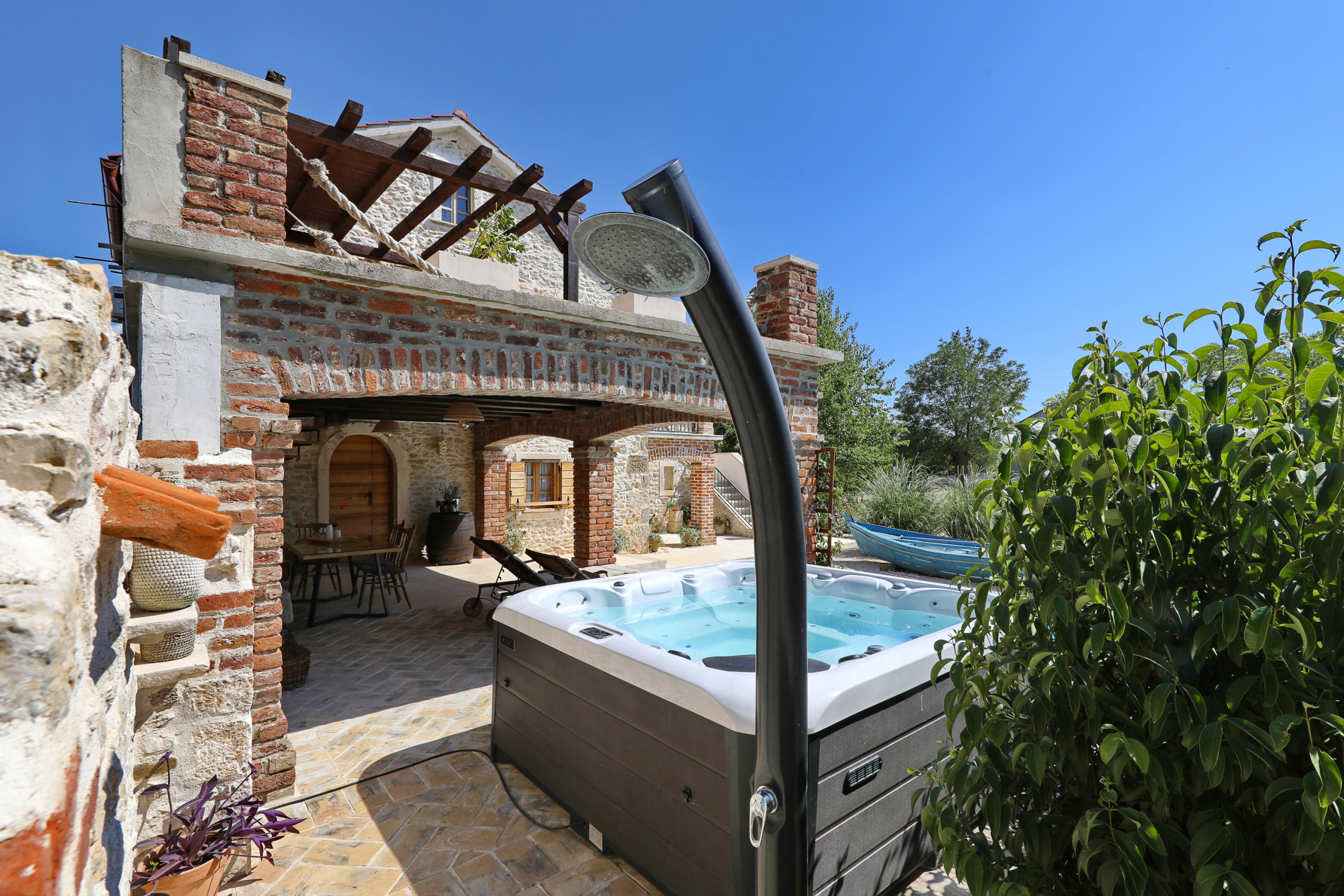 Im Garten erwartet Sie ein großer Pool. Auf der überdachten Terrasse steht für Sie eine gemütliche Sitzecke bereit, sowie Sonnenliegen die zum Verweilen einladen. Versuchen Sie sich an dalmatinischen Spezialitäten und nutzen Sie den Grill. Der Whirlpool neben der Terrasse erhöht den Wohlfühlfaktor. Von der Terrasse im Erdgeschoss geht eine Wendeltreppe auf, von der Sie auf den großen und möblierten Balkon gelangen. Bewundern Sie von hier den klaren Sternenhimmel und den Blick auf das große Anwesen.