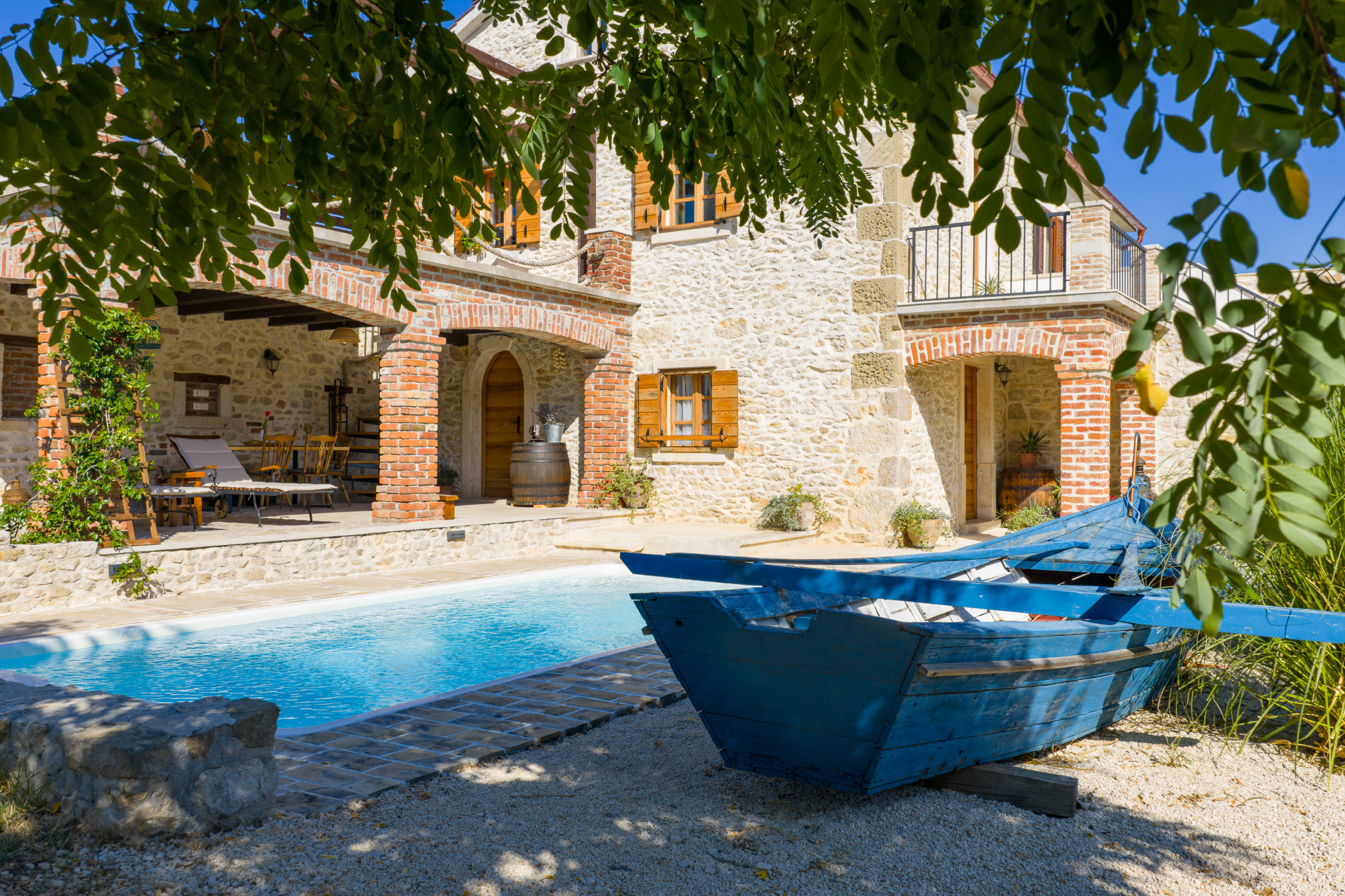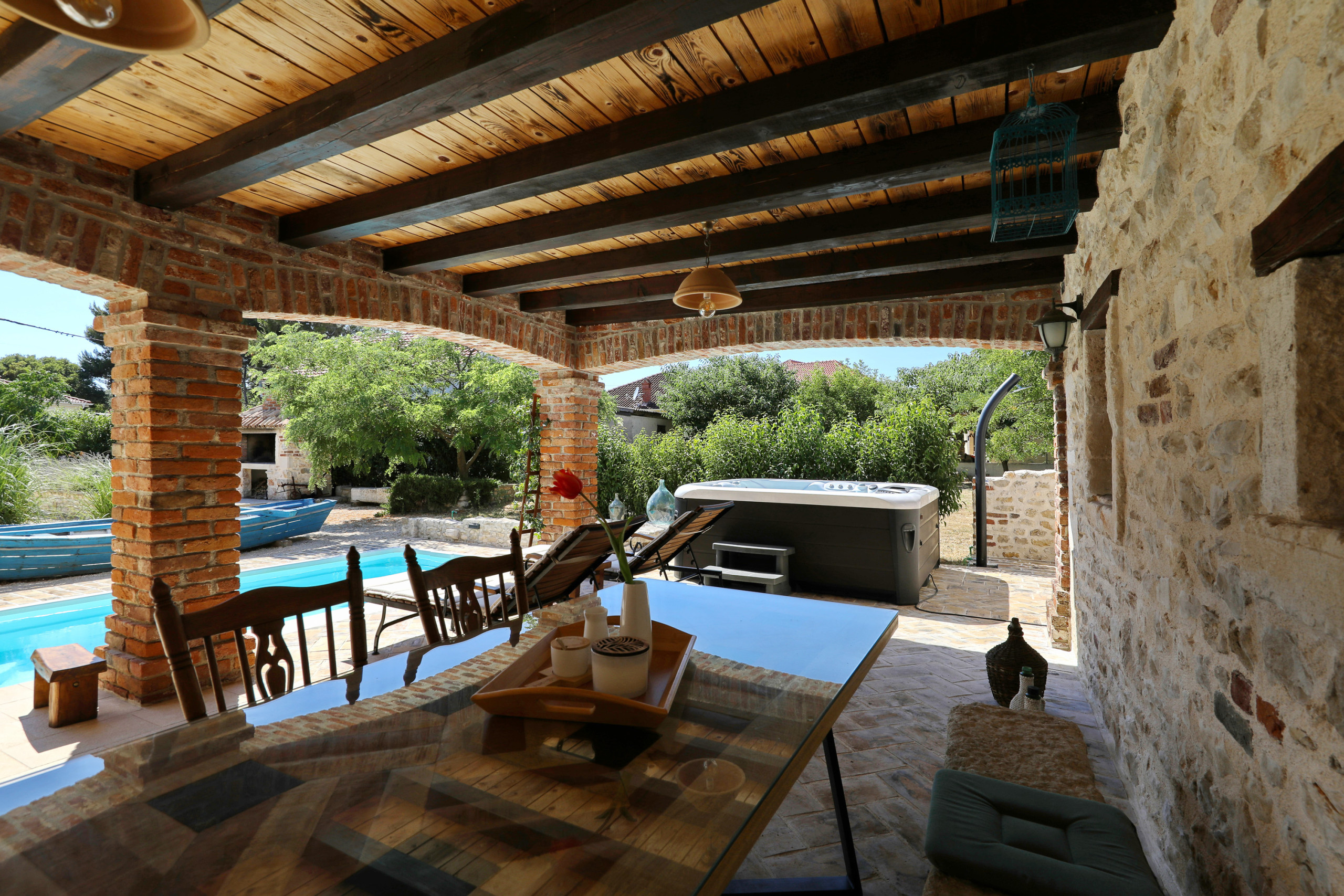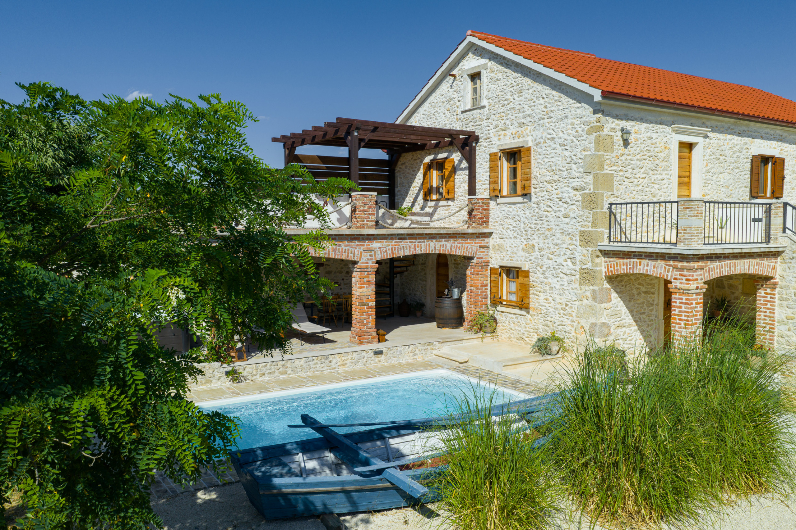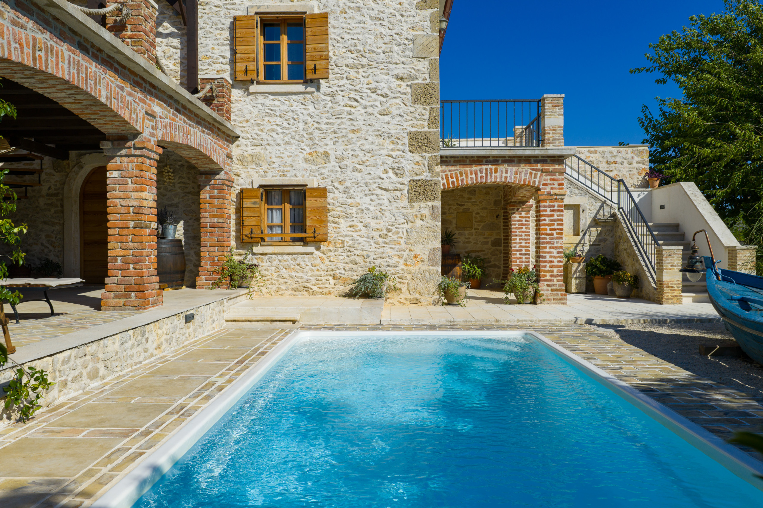 Im Garten erwartet Sie ein großer Pool. Auf der überdachten Terrasse steht für Sie eine gemütliche Sitzecke bereit, sowie Sonnenliegen die zum Verweilen einladen. Versuchen Sie sich an dalmatinischen Spezialitäten und nutzen Sie den Grill. Der Whirlpool neben der Terrasse erhöht den Wohlfühlfaktor. Von der Terrasse im Erdgeschoss geht eine Wendeltreppe auf, von der Sie auf den großen und möblierten Balkon gelangen. Bewundern Sie von hier den klaren Sternenhimmel und den Blick auf das große Anwesen.