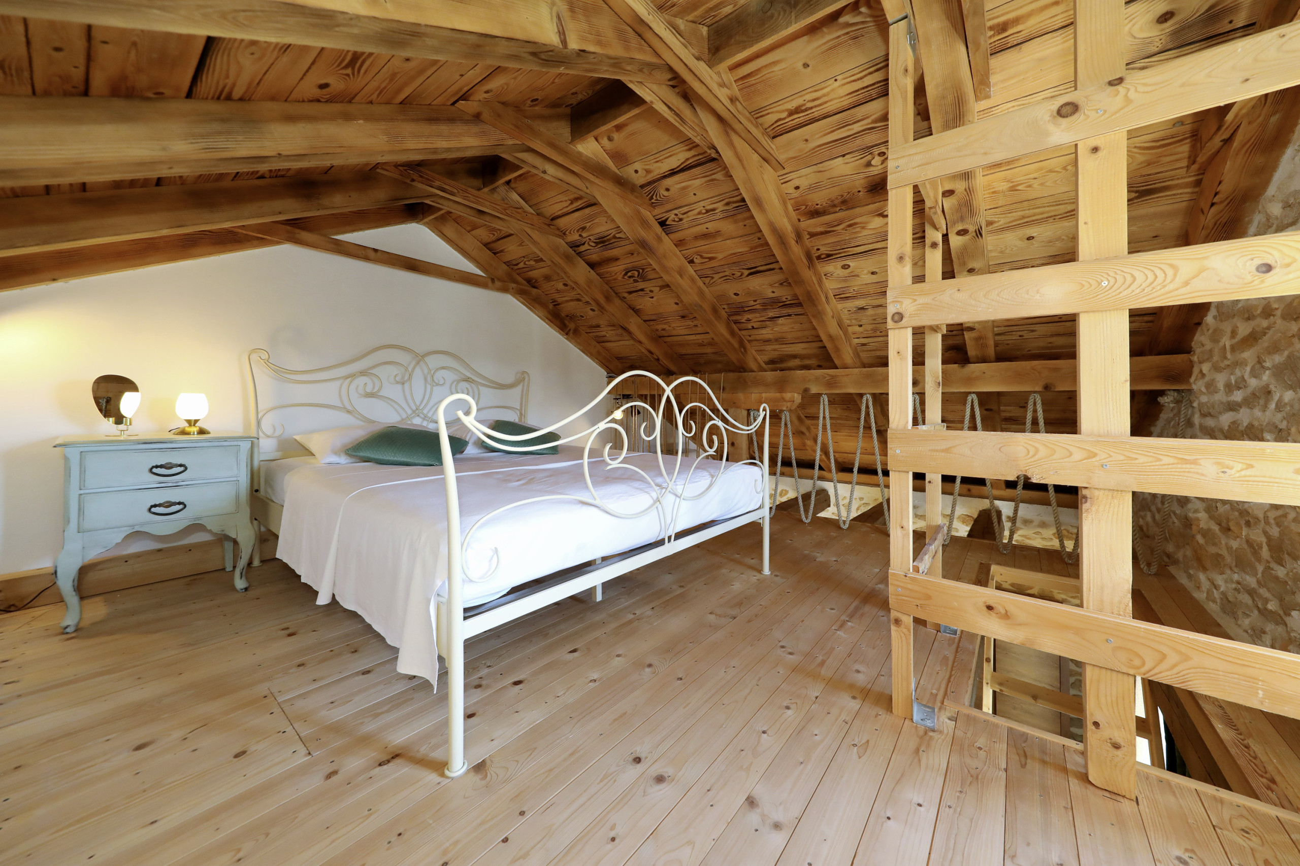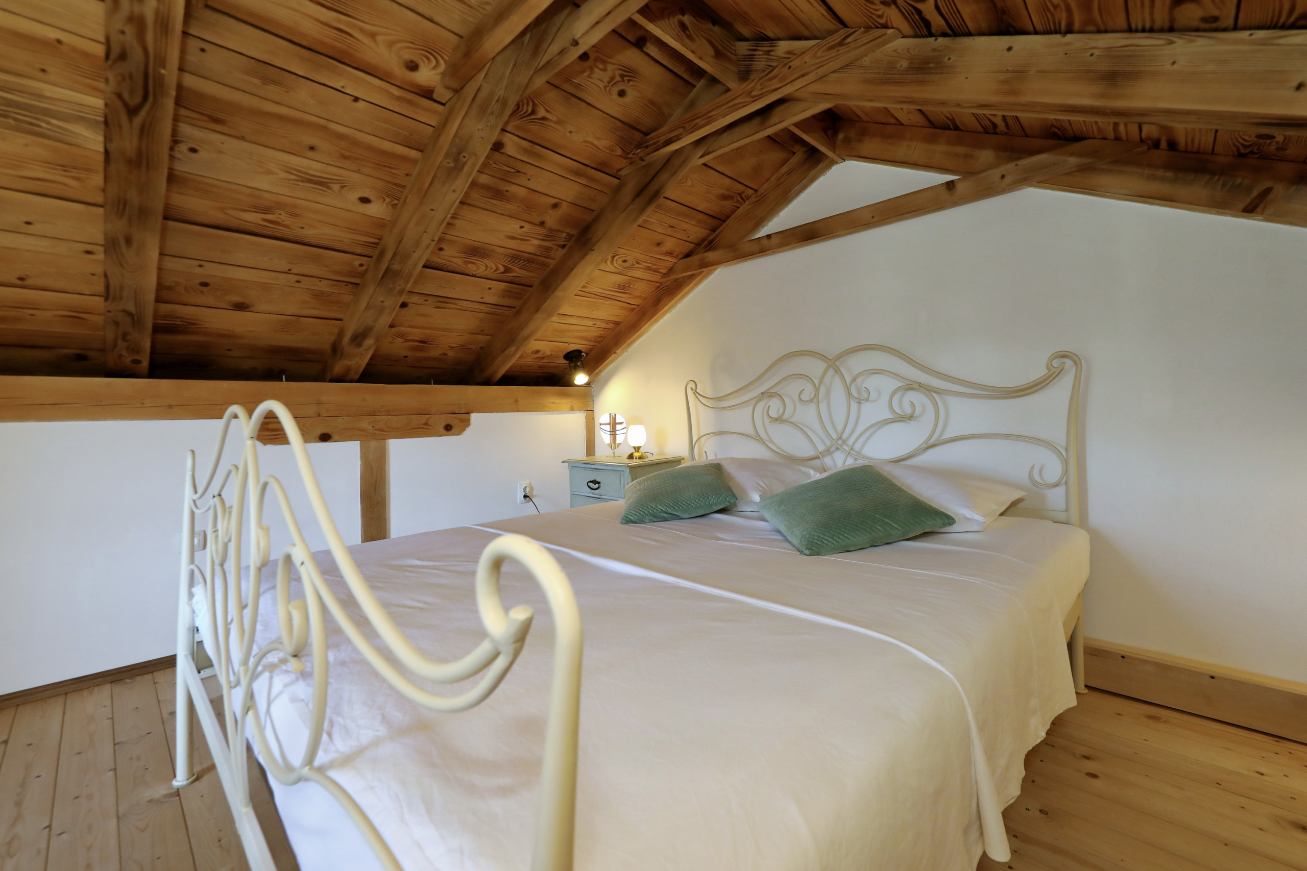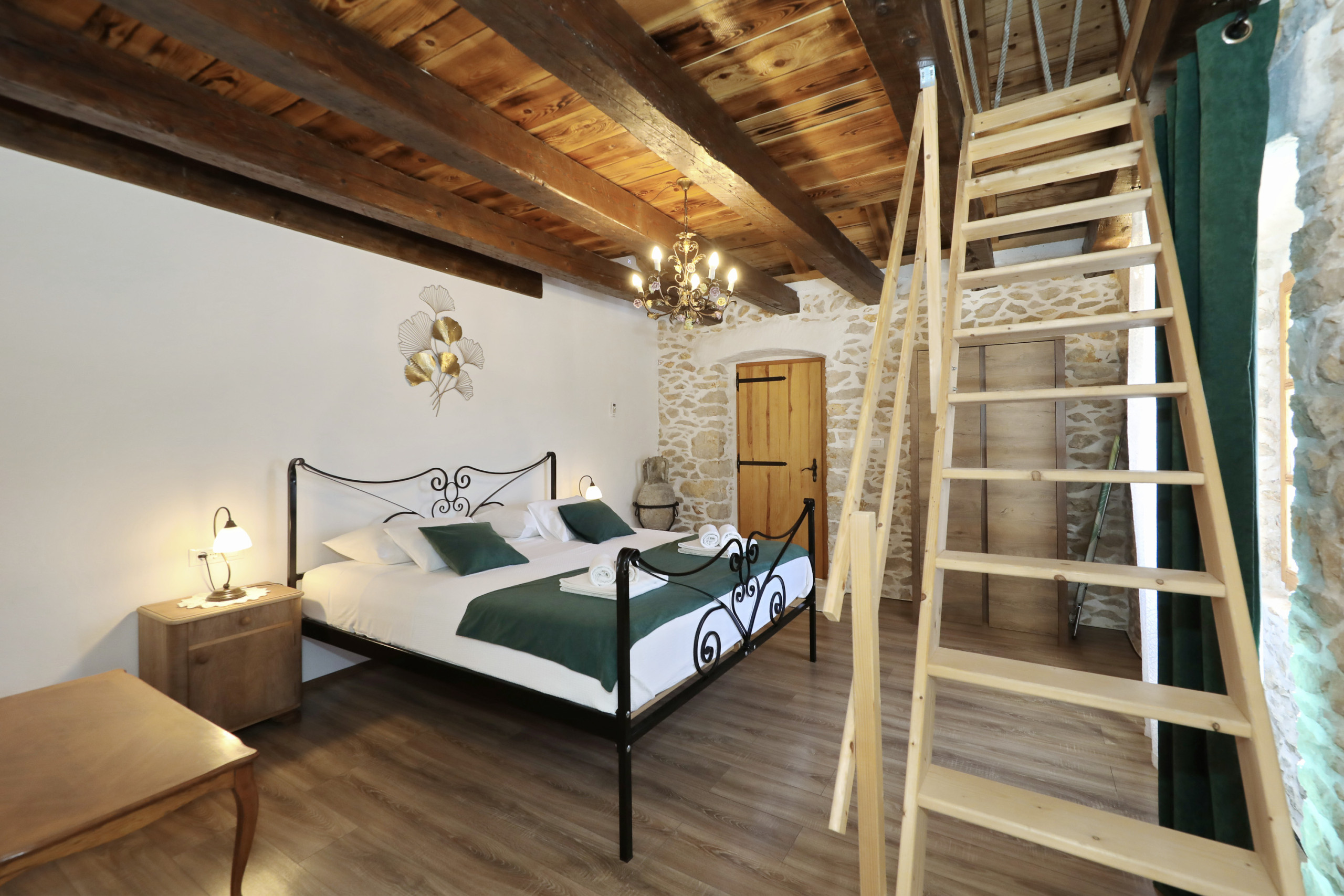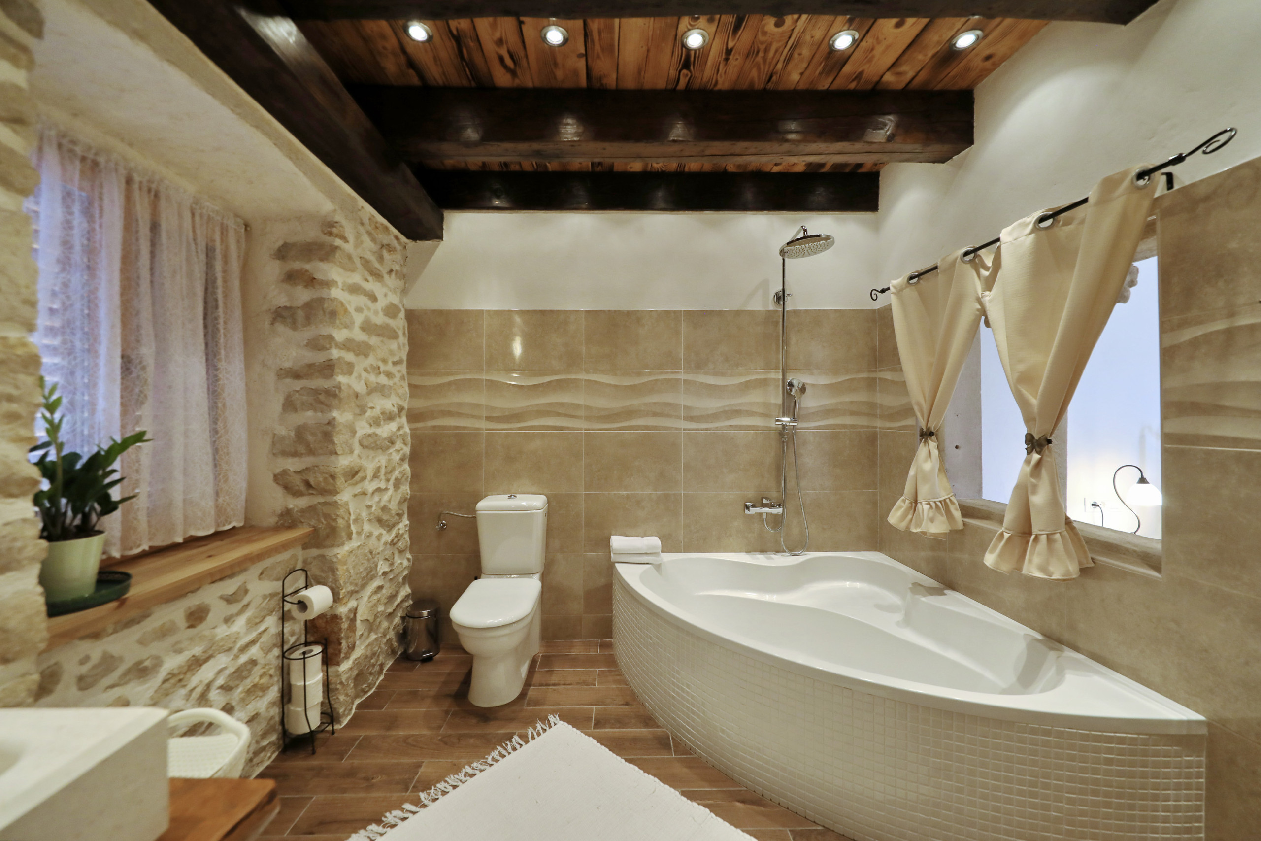 ... malerischen Garten mit vielen schattigen Plätzen zum Entspannen. Das offene und geschmackvolle Schlafzimmer ist mit einem Komfortablen Doppelbett und ebenso geschmackvollen en suit Badezimmer ausgestattet. Das Badezimmer ist mit einer Eckbadewanne und stilvollen Details eingerichtet. Vom Schlafzimmer aus führt eine Treppe in das Dachgeschoss, in welchem Sie ein weiteres komfortables Doppelbett erwartet. Der große Wohnraum mit integrierter Küche besticht durch seine authentische und wohltuende Atmosphäre und eindrucksvolle Dekoration. Die vielen Details aus Holz und Stein, sowie seltene Steinplatten die verarbeitet wurden, bieten außergewöhnliches Wohnen im gehobenem Ambiente.