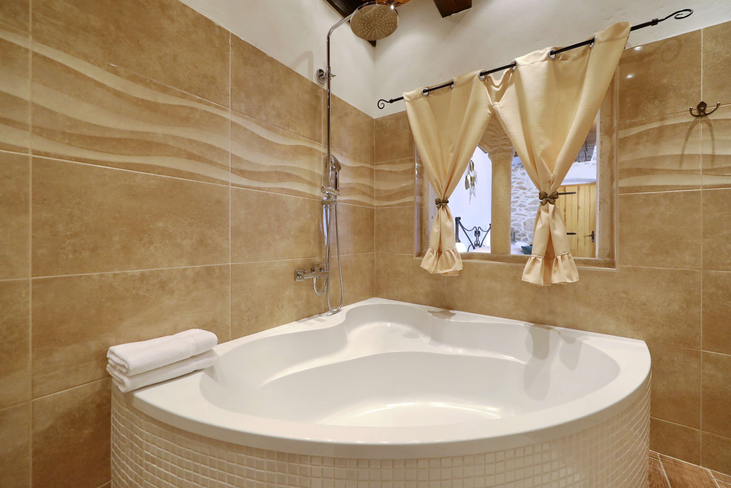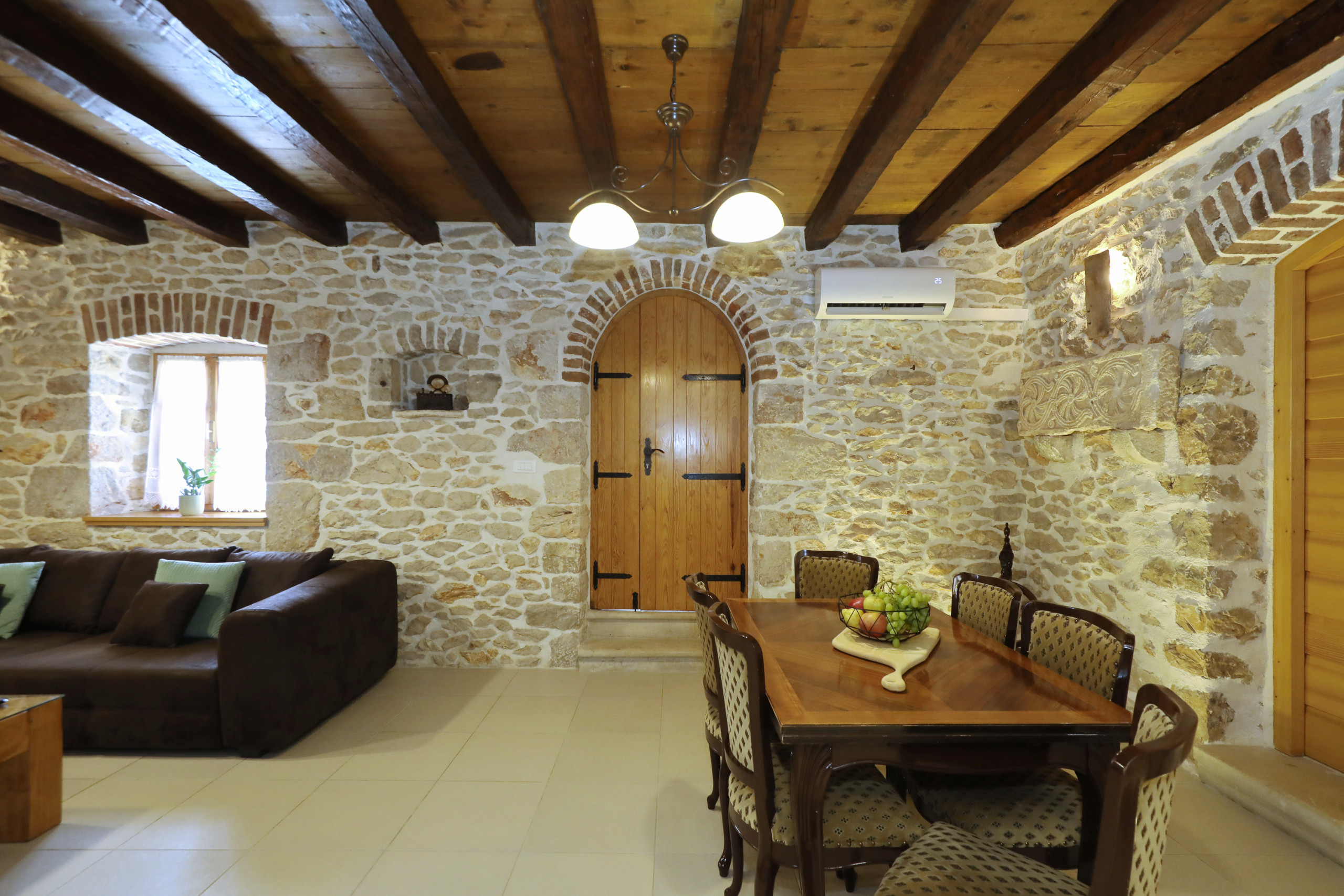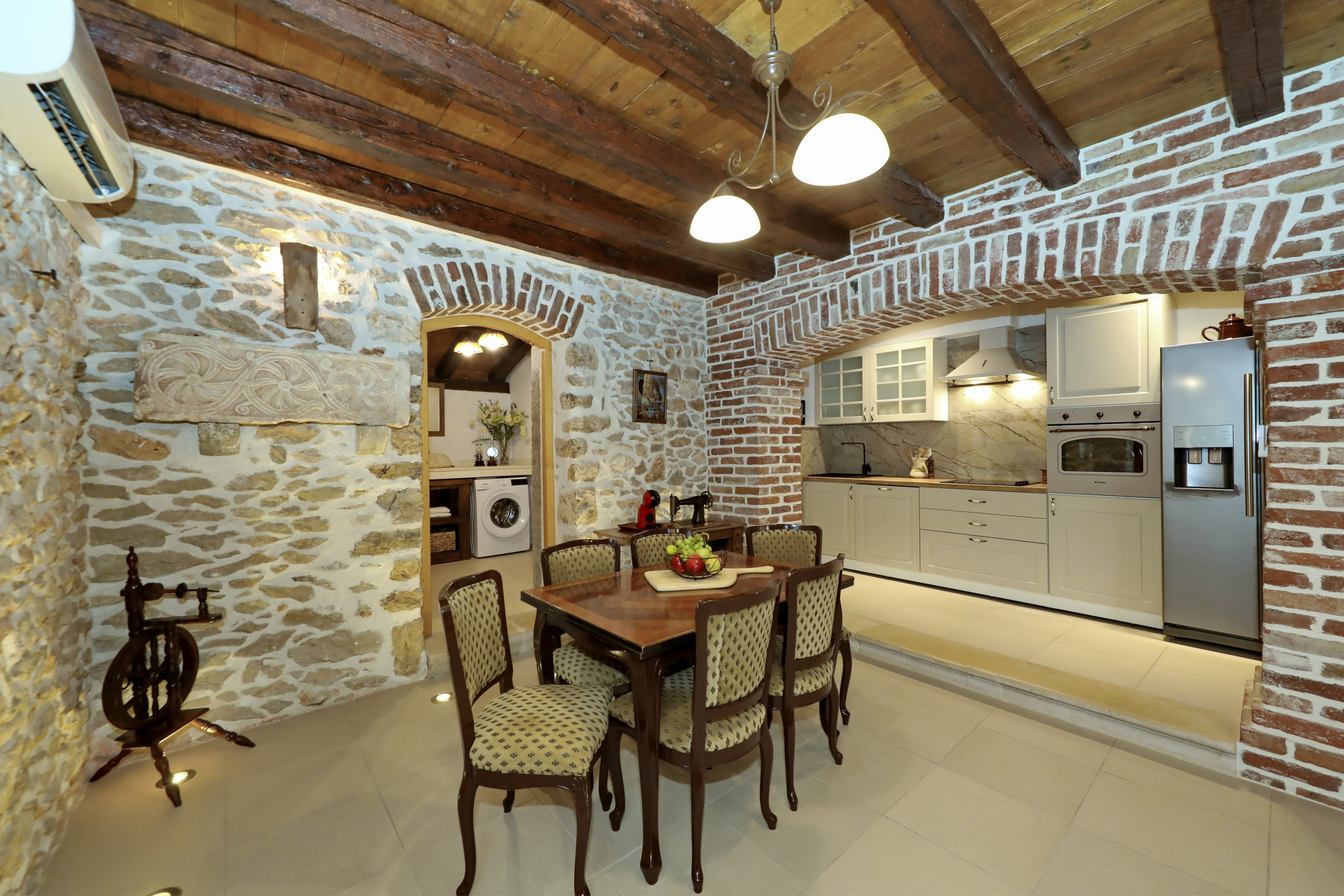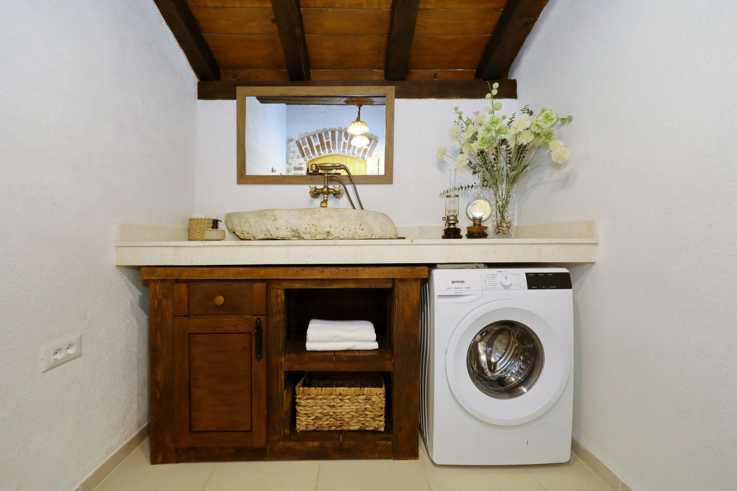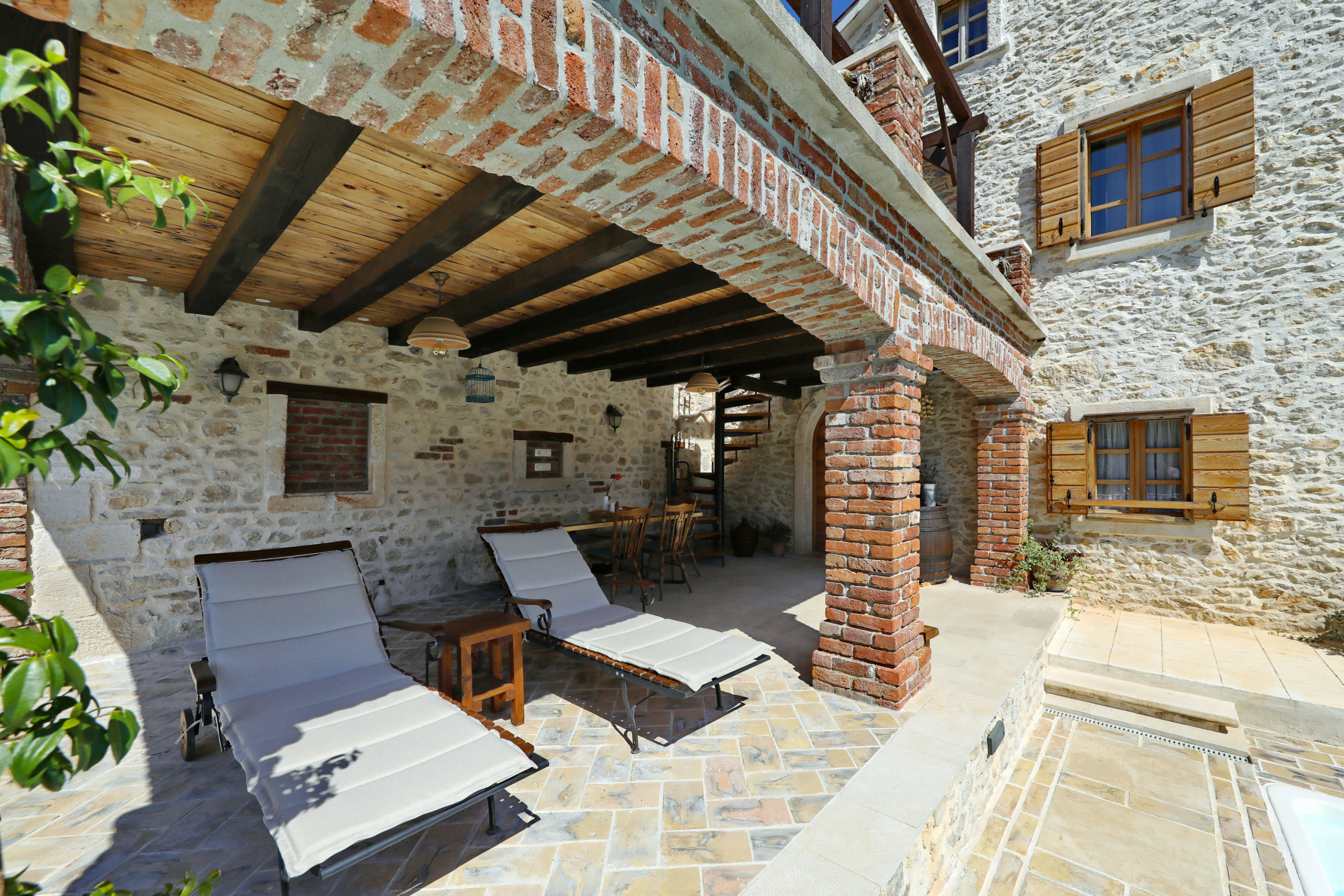 ... malerischen Garten mit vielen schattigen Plätzen zum Entspannen. Das offene und geschmackvolle Schlafzimmer ist mit einem Komfortablen Doppelbett und ebenso geschmackvollen en suit Badezimmer ausgestattet. Das Badezimmer ist mit einer Eckbadewanne und stilvollen Details eingerichtet. Vom Schlafzimmer aus führt eine Treppe in das Dachgeschoss, in welchem Sie ein weiteres komfortables Doppelbett erwartet. Der große Wohnraum mit integrierter Küche besticht durch seine authentische und wohltuende Atmosphäre und eindrucksvolle Dekoration. Die vielen Details aus Holz und Stein, sowie seltene Steinplatten die verarbeitet wurden, bieten außergewöhnliches Wohnen im gehobenem Ambiente.