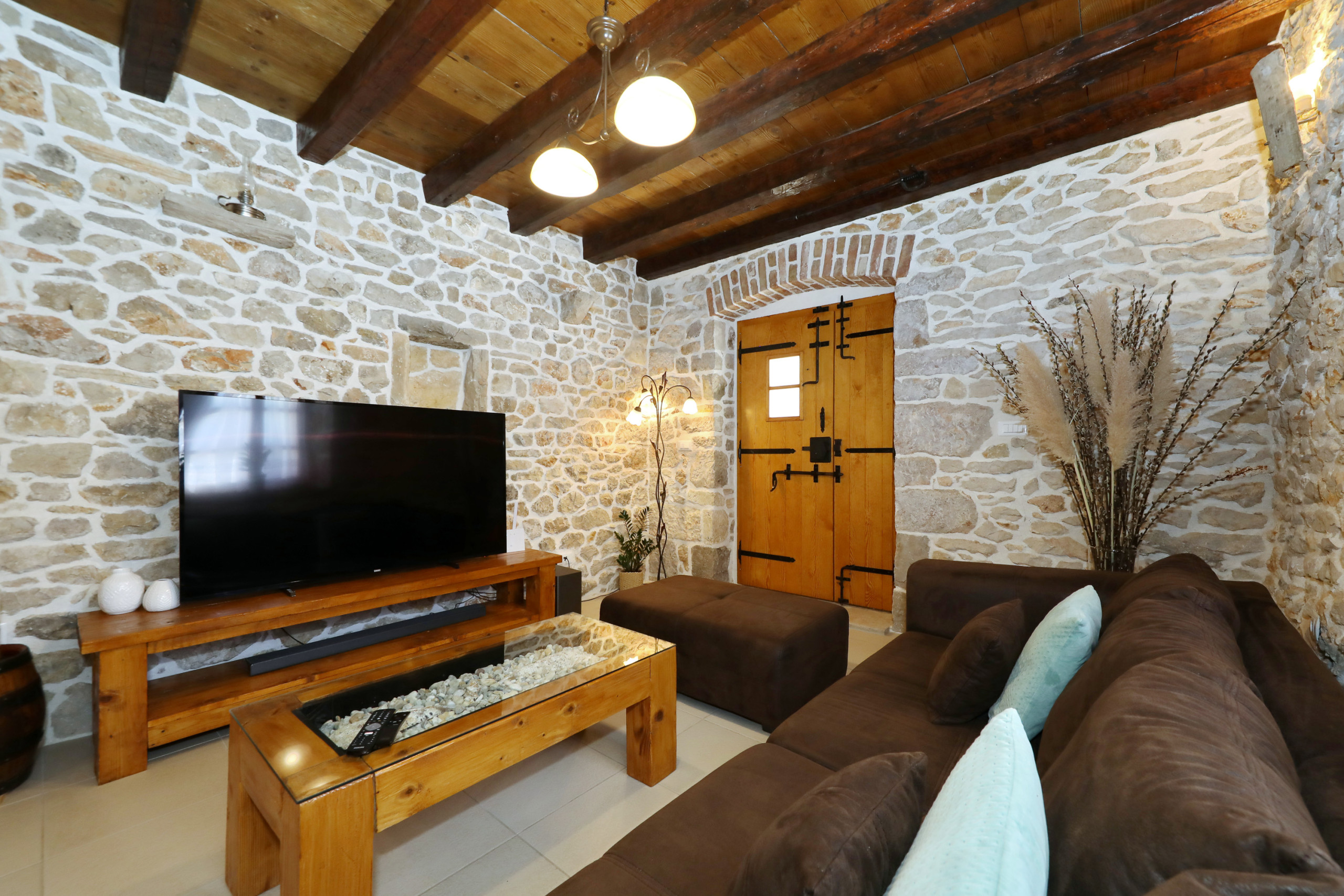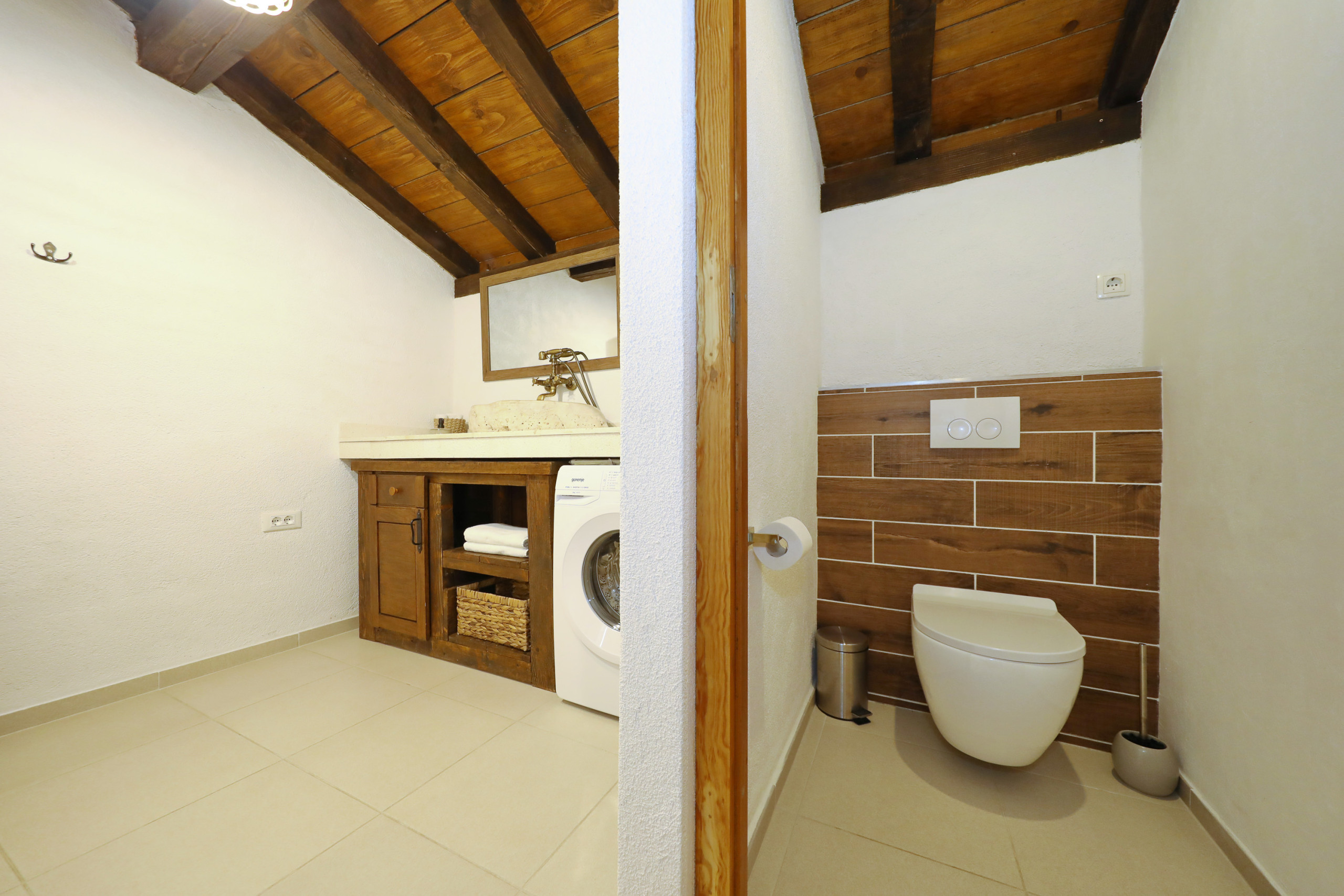 Gland ist eine wunderschöne Villa, umgeben von einem malerischen Garten mit vielen schattigen Plätzen zum Entspannen. Das offene und geschmackvolle Schlafzimmer ist mit einem Komfortablen Doppelbett und ebenso geschmackvollen en suit Badezimmer ausgestattet. Das Badezimmer ist mit einer Eckbadewanne und stilvollen Details eingerichtet. Vom Schlafzimmer aus führt eine Treppe in das Dachgeschoss, in welchem Sie ein weiteres komfortables Doppelbett erwartet. Der große Wohnraum mit integrierter Küche besticht durch seine authentische und wohltuende Atmosphäre und eindrucksvolle Dekoration. Die vielen Details aus Holz und Stein, sowie seltene Steinplatten die verarbeitet wurden, bieten außergewöhnliches Wohnen im gehobenem Ambiente.