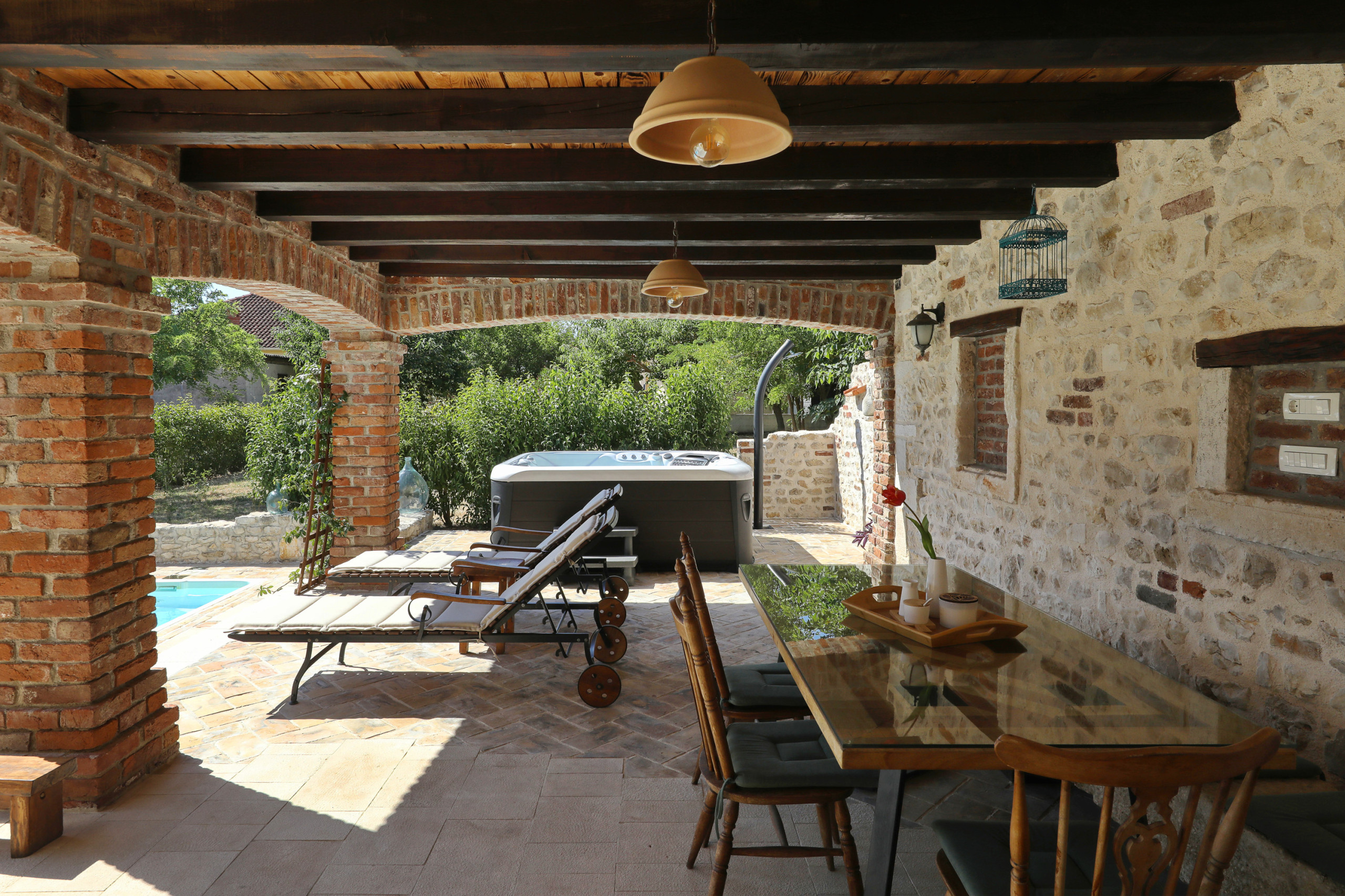 Zusammenfassend bietet die Villa Gland eine perfekte Unterkunft für einen ruhigen und erholsamen, aber dennoch besonderen Urlaub. Freuen Sie sich auf den großen Pool und Whirlpool mit gemütlichen Verweilmöglichkeiten und einen sattgrünen Garten. Die vielen Details aus Holz und Stein, sowie seltene Steinplatten die verarbeitet wurden, bieten außergewöhnliches Wohnen im gehobenem Ambiente.